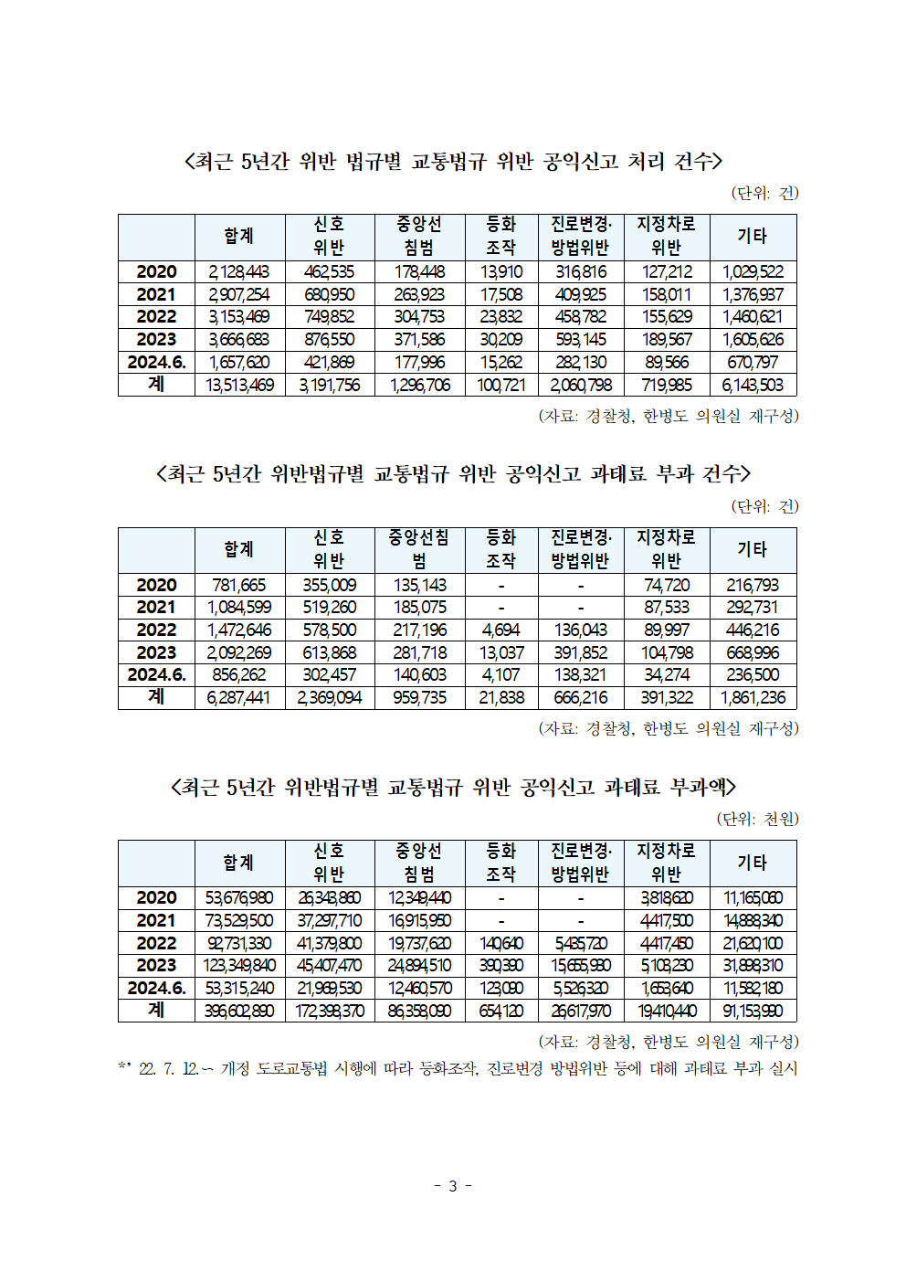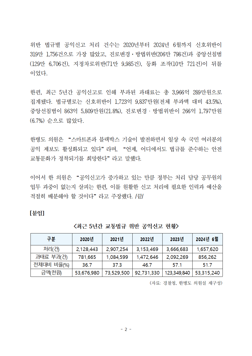 [한병도의원]2024행안위국정감사보도자료(24)최근 5년간 교통법규 위반 공익신고 1351만건... 부과된 과태료만 4천억원 육박.hwp
