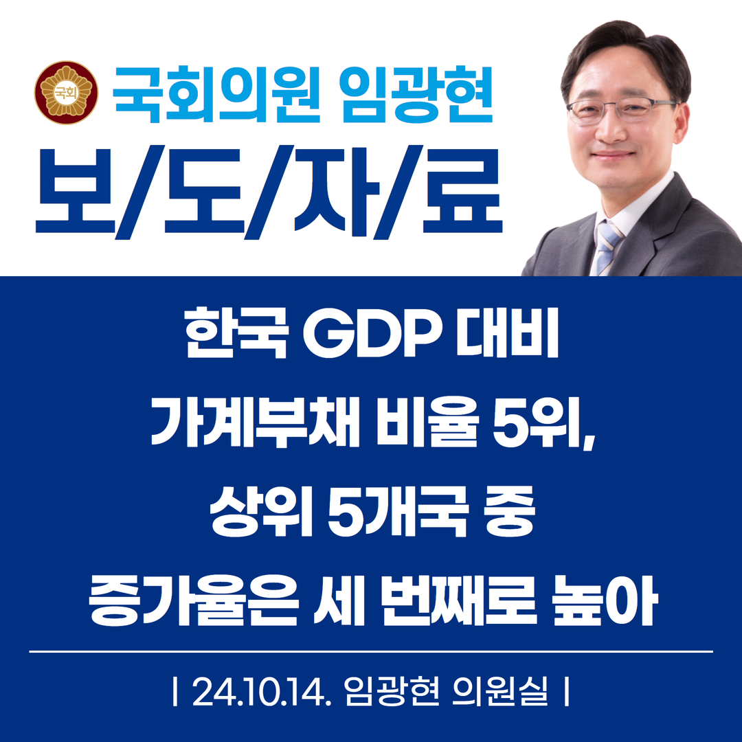 [임광현의원 국감 보도] 한국 GDP 대비가계부채 비율 5위, 상위 5개국 중 증가율은 세 번째로 높아