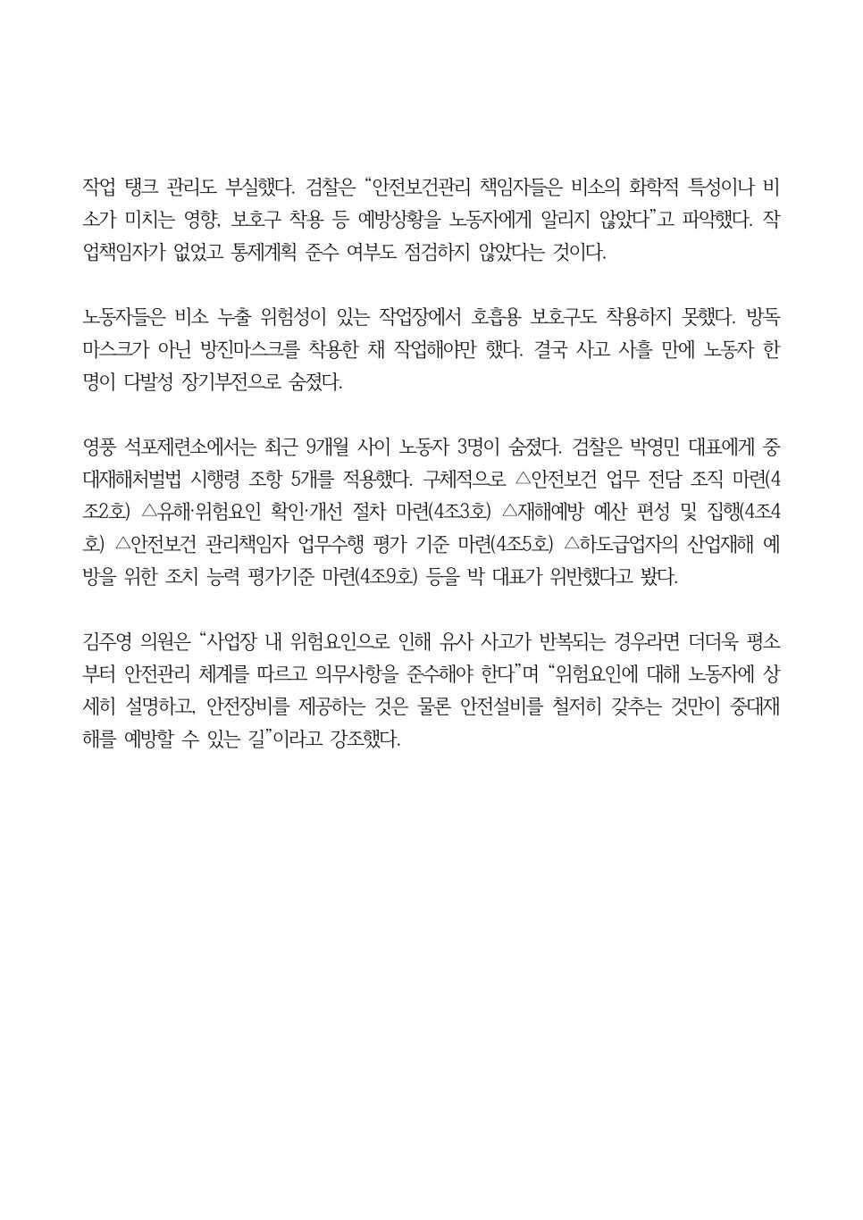 공소장엔 박 대표는 중대재해 처벌 등에 관한 법률(중대재해처벌법) 등 세 개 법률을 위반한 것으로 적혔다.
