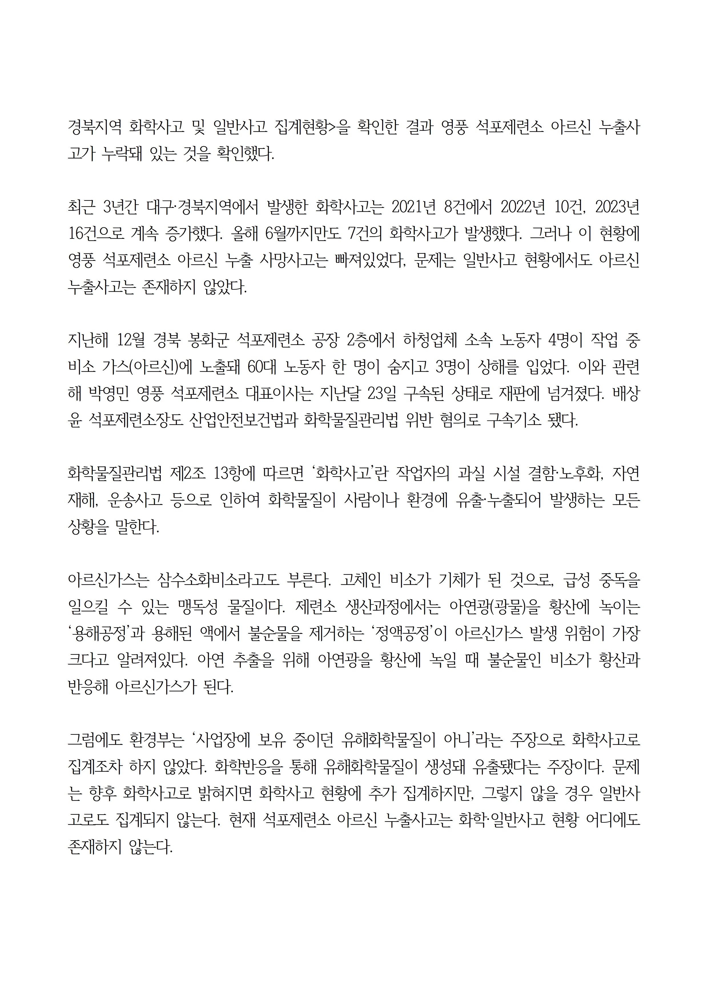 최근 3년간 대구·경북지역에서 발생한 화학사고는 2021년 8건에서 2022년 10건, 2023년 16건으로 계속 증가했다. 올해 6월까지만도 7건의 화학사고가 발생했다. 그러나 이 현황에 영풍 석포제련소 아르신 누출 사망사고는 빠져있었다, 문제는 일반사고 현황에서도 아르신 누출사고는 존재하지 않았다.