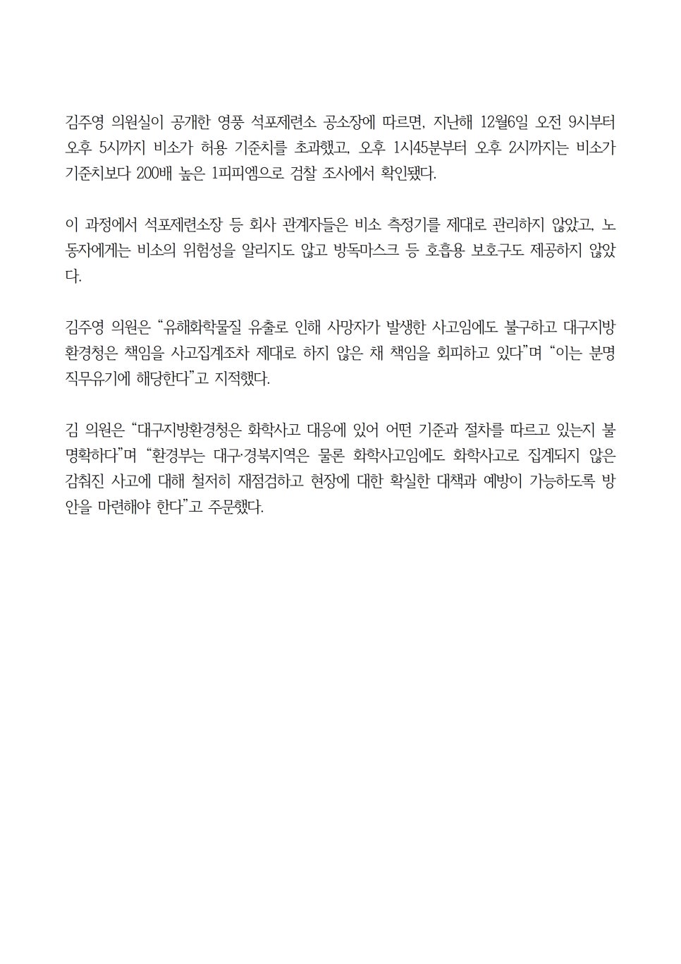 김주영 의원은 “유해화학물질 유출로 인해 사망자가 발생한 사고임에도 불구하고 대구지방환경청은 책임을 사고집계조차 제대로 하지 않은 채 책임을 회피하고 있다”며 “이는 분명 직무유기에 해당한다”고 지적했다.