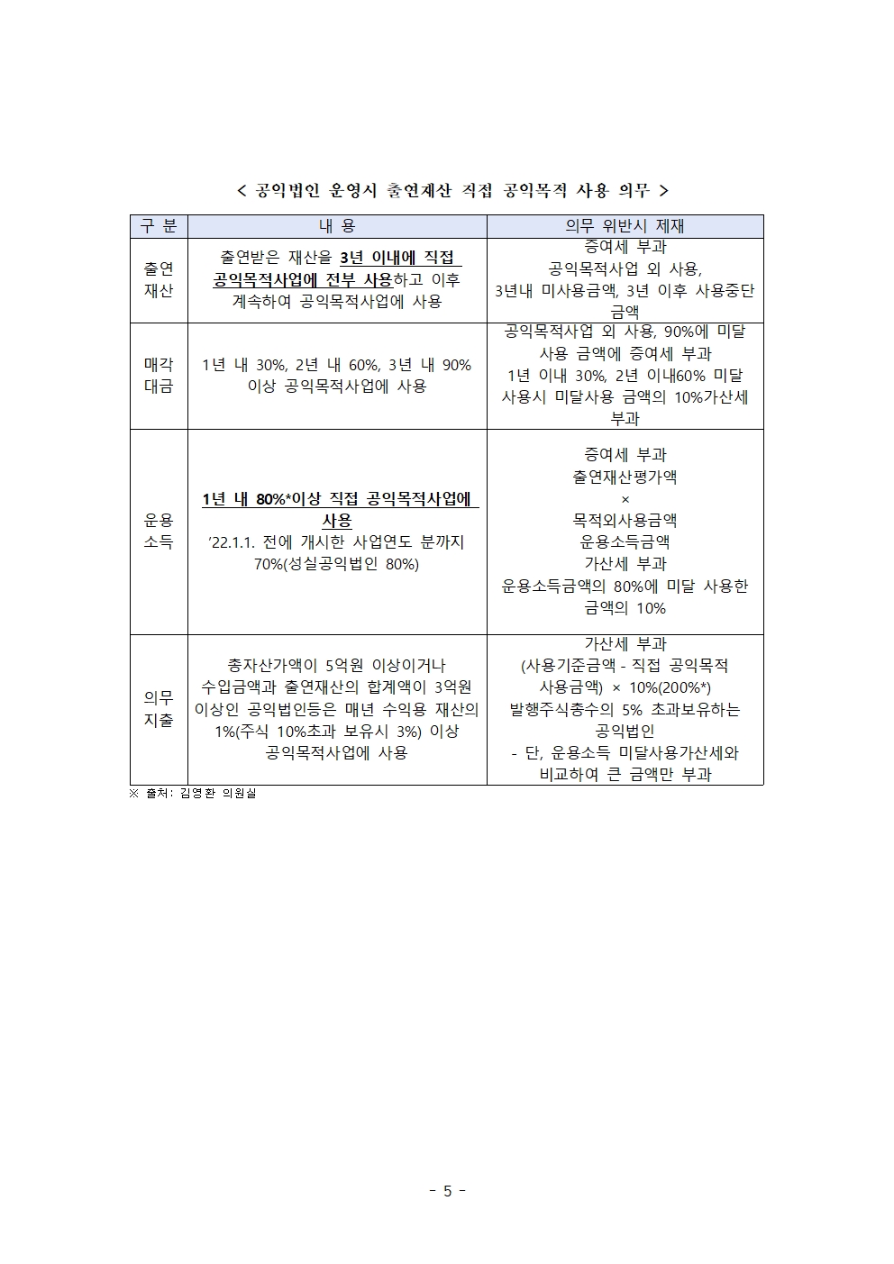 [김영환 의원(고양시 정) 보도자료] 세제 혜택 먹튀 수단으로 전락한 공익법인, 관리는 엉망