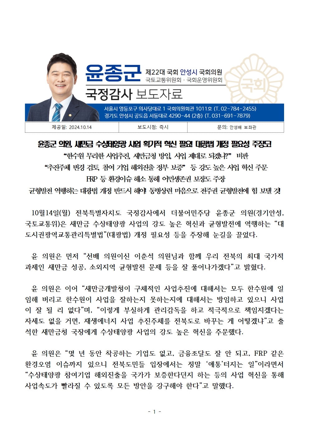 241014_윤종군 의원 새만금 수상태양광 사업 획기적 혁신 필요! 대광법 개정 필요성 주장도!.hwp