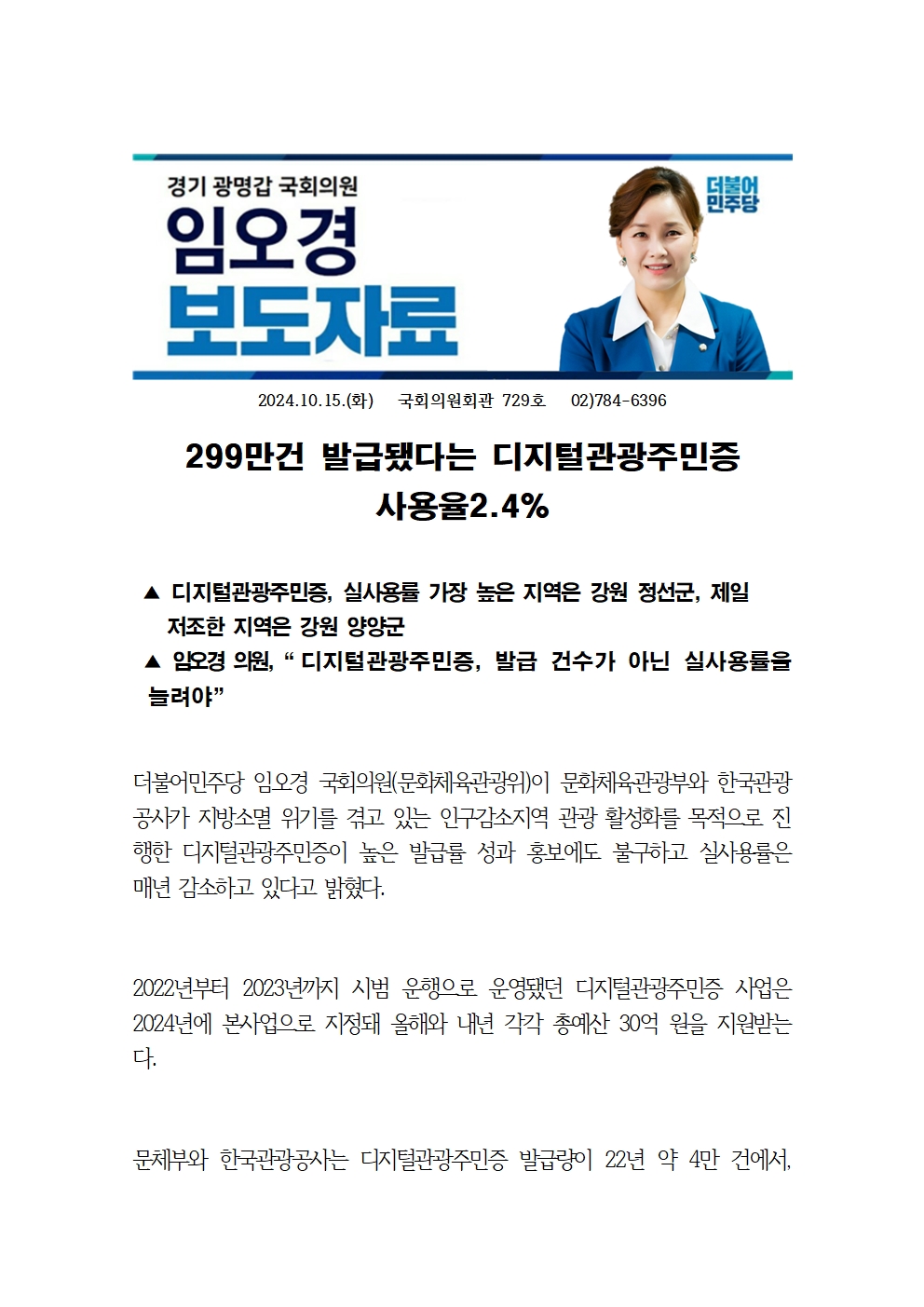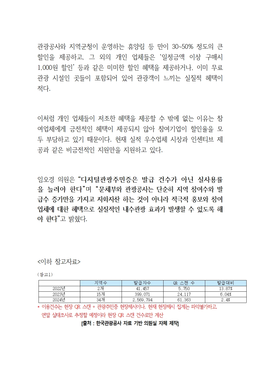 241015 [임오경 국회의원 보도] 디지털관광주민증_ 발급 건수가 아닌 실사용률을 늘려야.hwp
