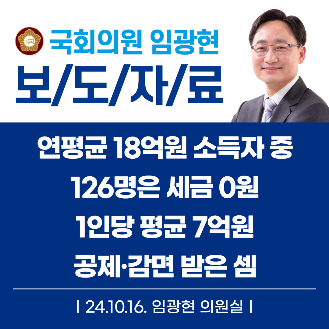 [임광현의원 국감 보도] 연평균 18억원 소득자 중 126명은 세금 0원1인당 평균 7억원 공제·감면 받은 셈