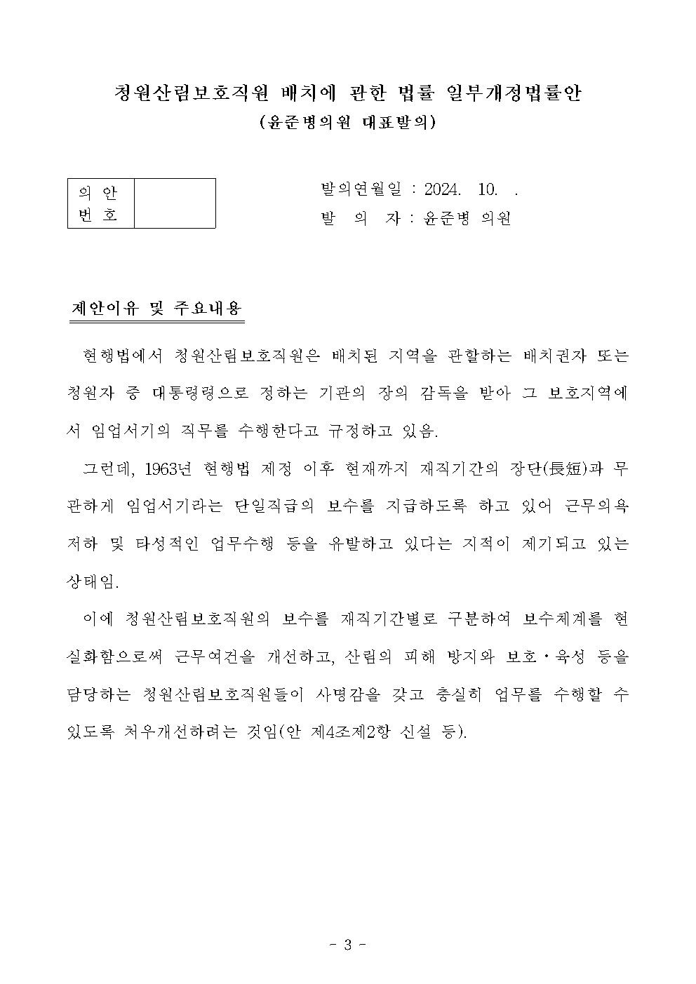 241016 [윤준병 의원 국정감사 보도자료] 윤준병 의원 국정감사 대안 ‘청원산림보호직원 처우개선법’ 발의.hwp