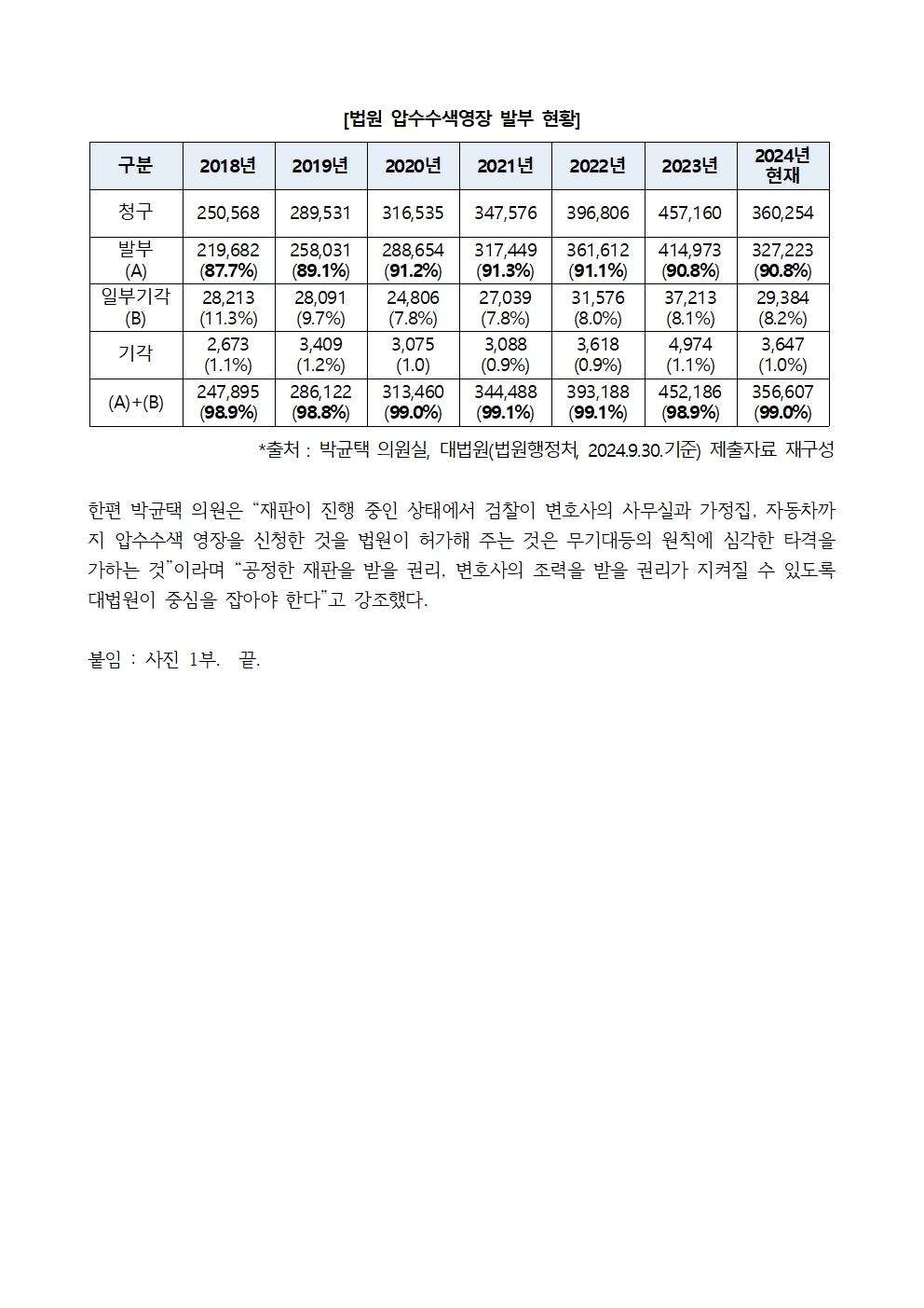 [박균택 의원 국정감사 보도자료] 박균택 의원, 법원의 압수수색 영장 발부율 99% “영장제도 의미 퇴색”