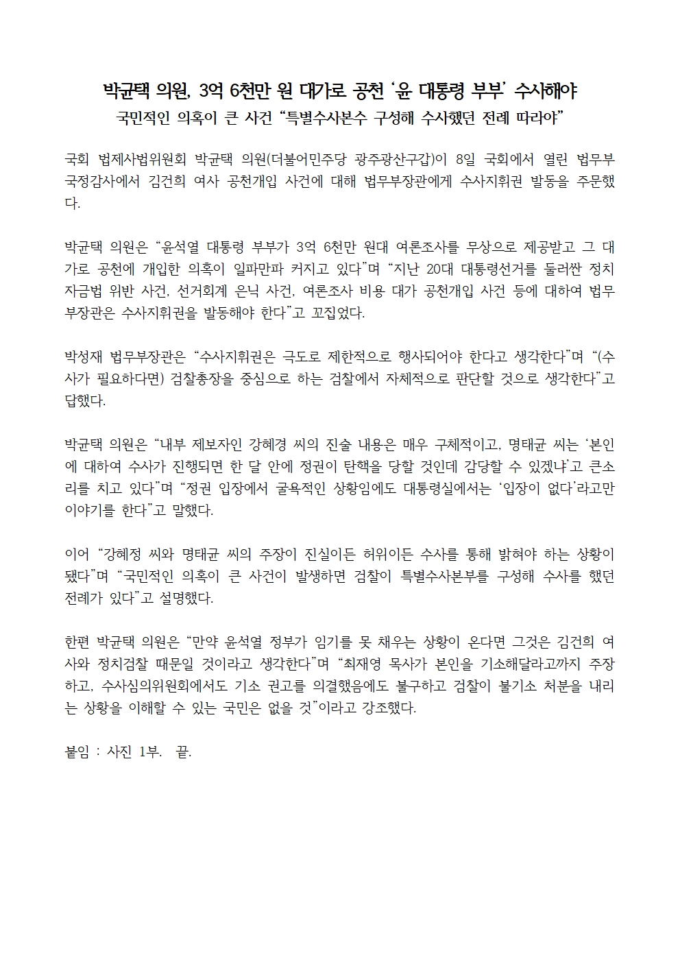 [박균택 의원 국정감사 보도자료] 박균택 의원, 3억 6천만 원 대가로 공천 ‘윤 대통령 부부’ 수사해야