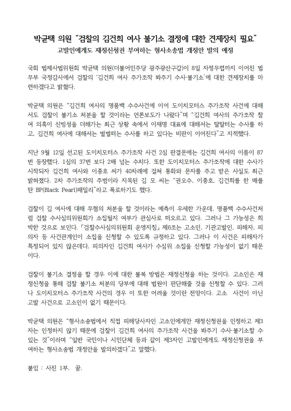 [박균택 의원 국정감사 보도자료] 박균택 의원, “검찰의 김건희 여사 불기소 결정에 대한 견제장치 필요”