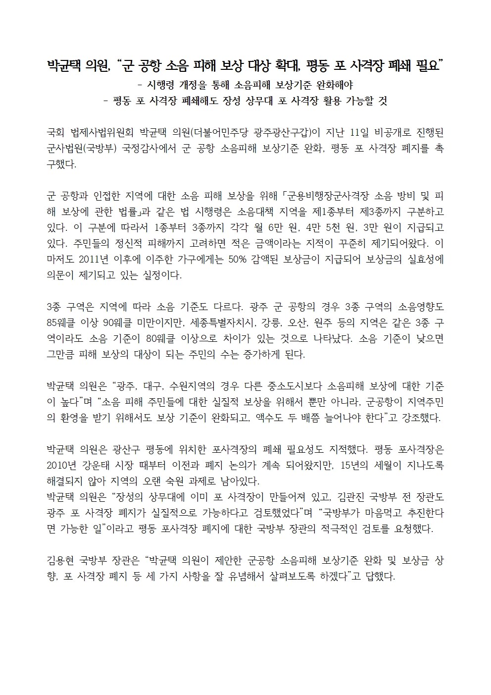 [박균택 의원 국정감사 보도자료] 박균택 의원, “군 공항 소음 피해 보상 대상 확대, 평동 포 사격장 폐쇄 필요”