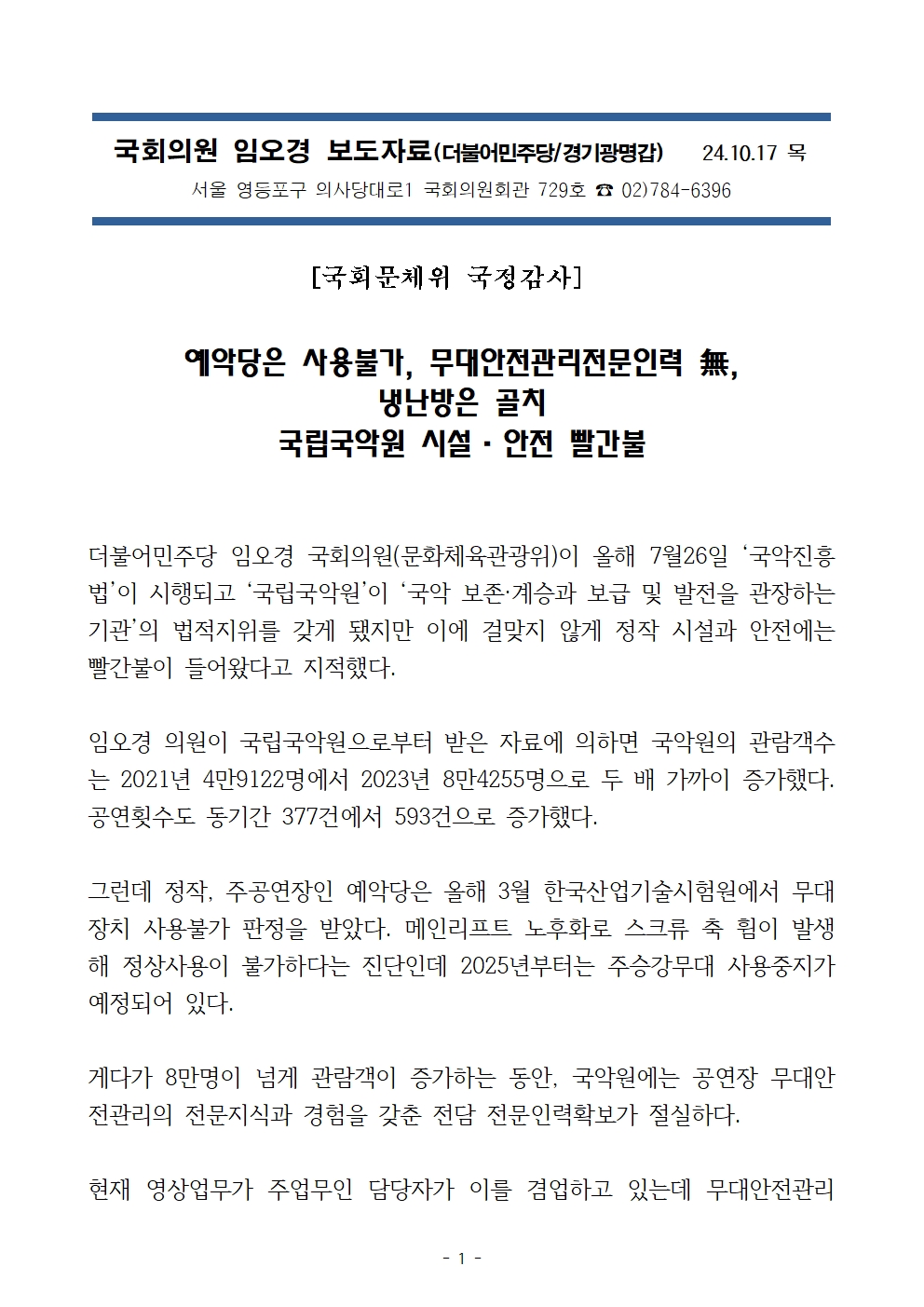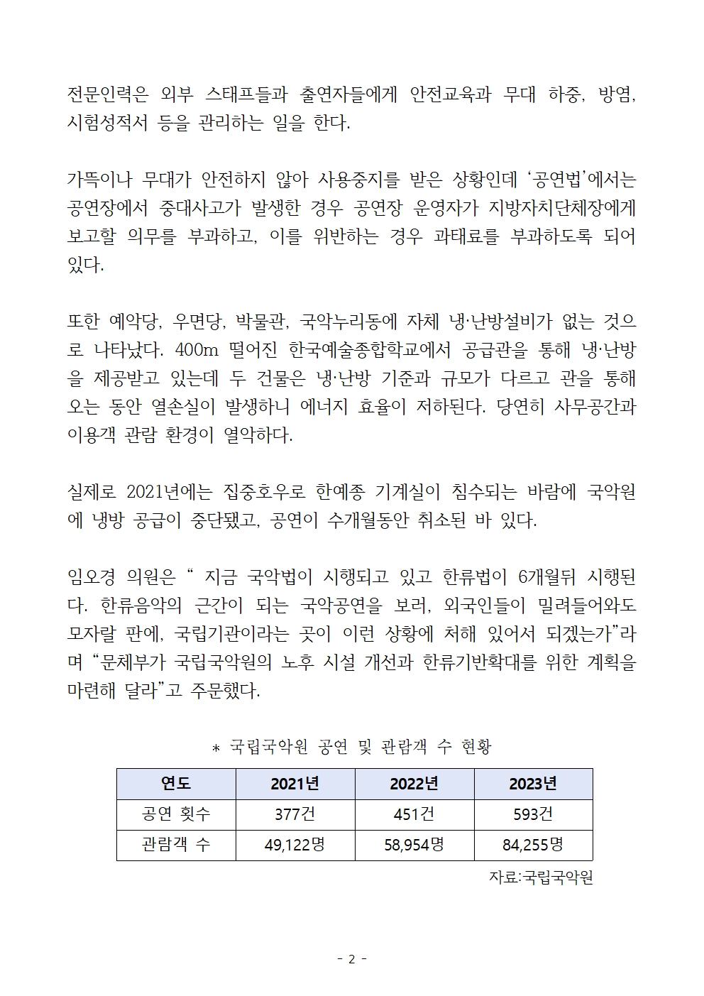 [국회의원 임오경 국감보도자료]예악당은 사용불가, 무대안전관리전문인력 無, 냉난방은 골치 국립국악원 시설·안전 빨간불