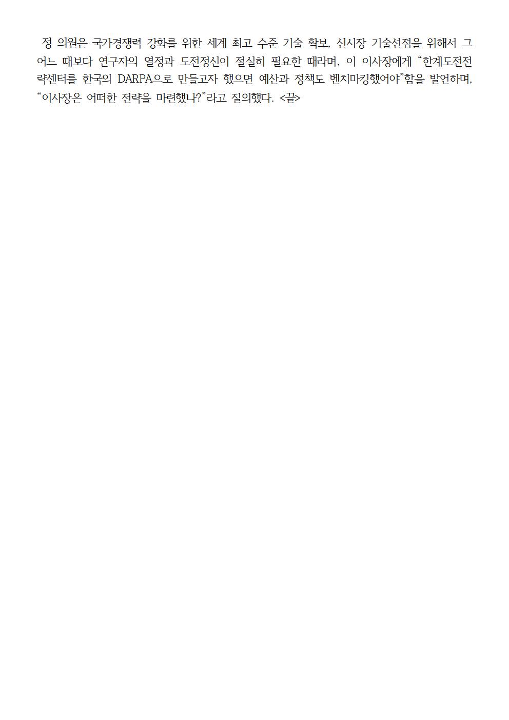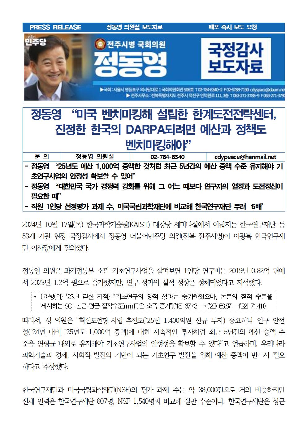 [국회의원 정동영 국감보도자료] 정동영 “미국 벤치마킹해 설립한 한계도전전략센터, 진정한 한국의 DARPA되려면 예산과 정책도 벤치마킹해야”