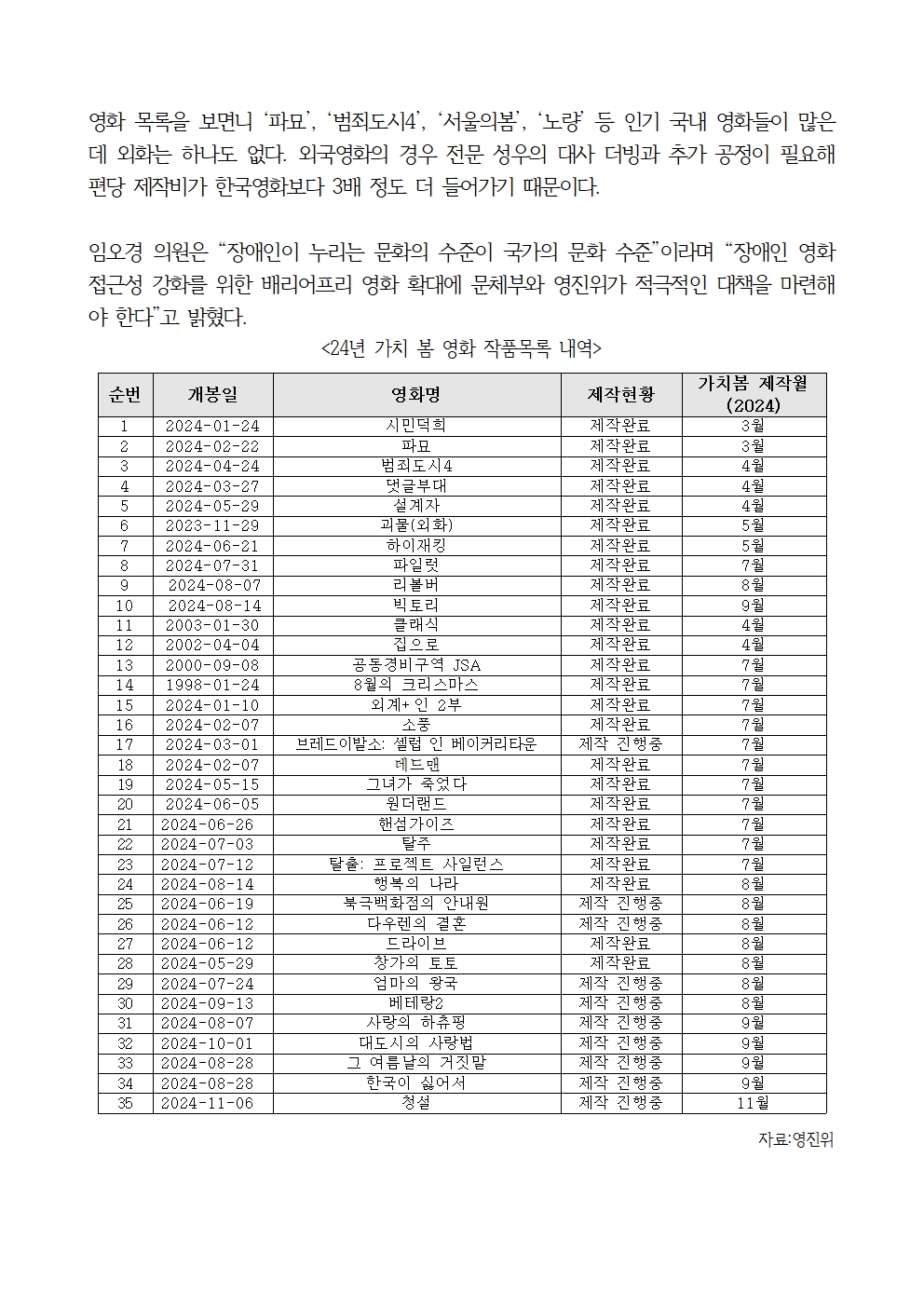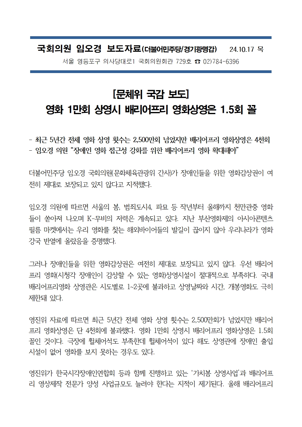 241017 임오경 국회의원 보도 - 영화 1만회 상영시 배리어프리 영화상영은 1.5회 꼴.hwp