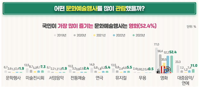 문체부의 ‘2023 국민문화예술 활동조사결과를 보면, 우리 국민이 가장 많이 즐기는 문화예술행사는 영화가 52.4%로 가장 높았고, 뒤이어 대중음악·연예 11.0%, 미술전시회 7.3%, 뮤지컬 5.5%, 연극 5.4% 등 순으로 나타났다. <붙임3 참조>
