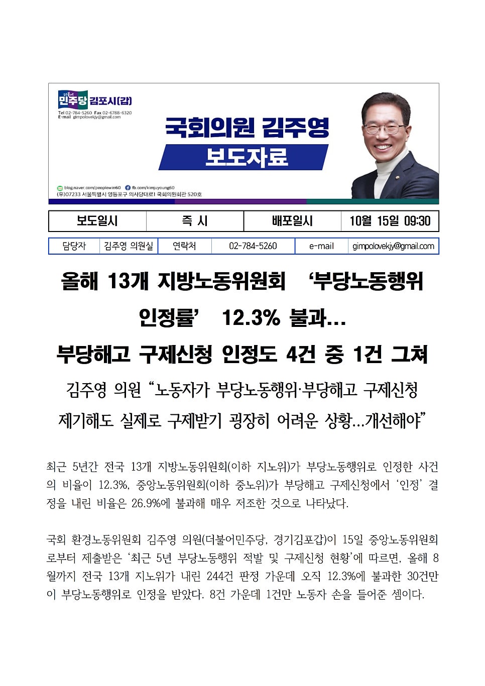 [국회의원 김주영] 올해 13개 지방노동위원회 ‘부당노동행위 인정률’ 12.3% 불과...부당해고 구제신청 인정도 4건 중 1건 그쳐