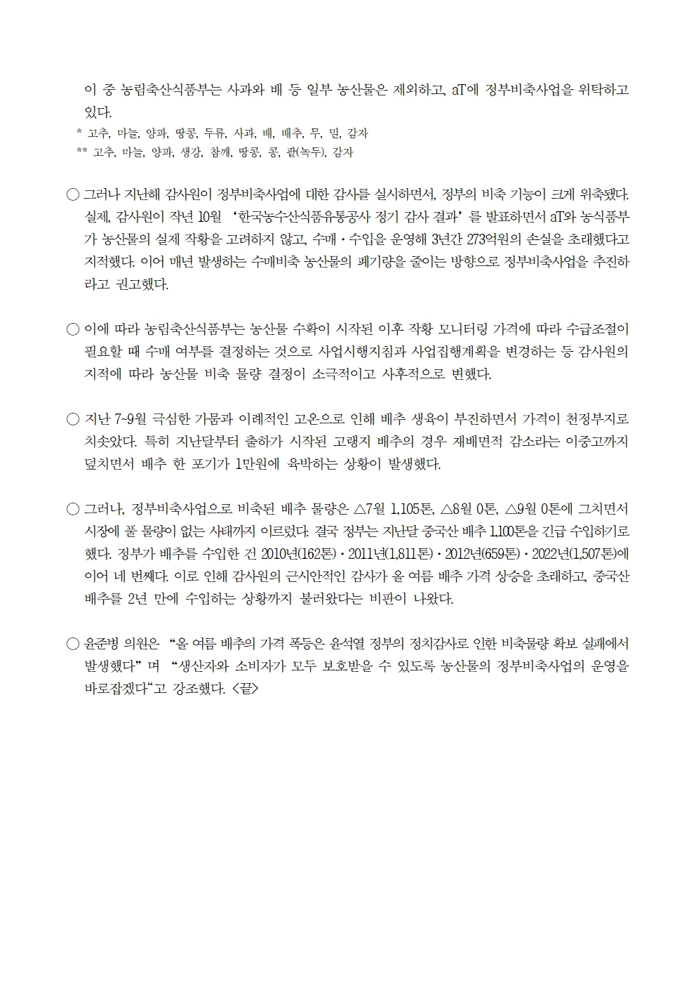 [윤준병 의원 국정감사 보도자료] 윤준병 의원_ 배추값 급등과 중국산 배추 긴급수입_ 근시안적 감사에 기인