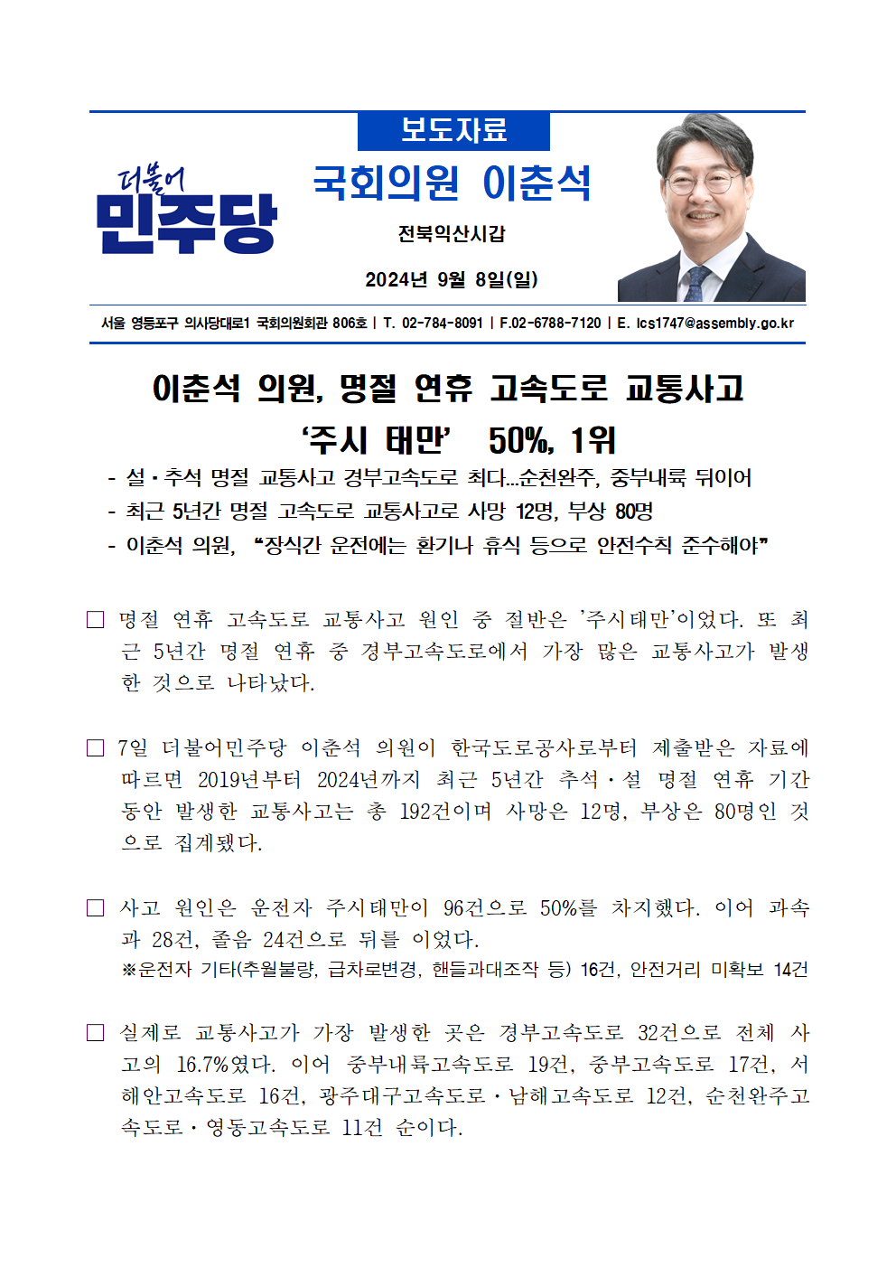 240908_이춘석 의원_ 이춘석 의원_ 명절 연휴 고속도로 교통사고 주시태만 50% 1위.hwp
