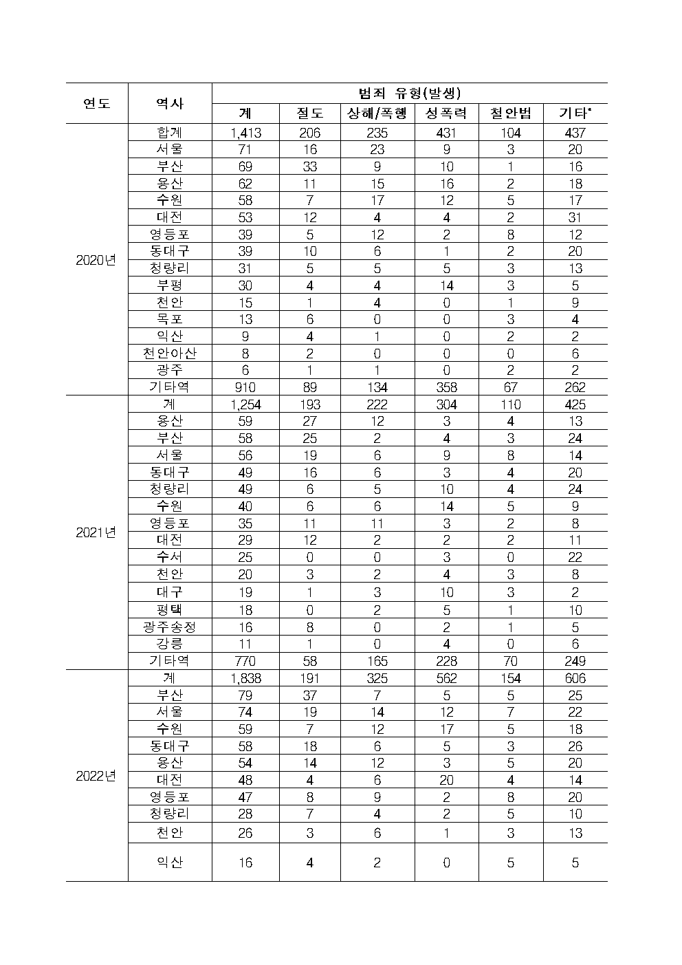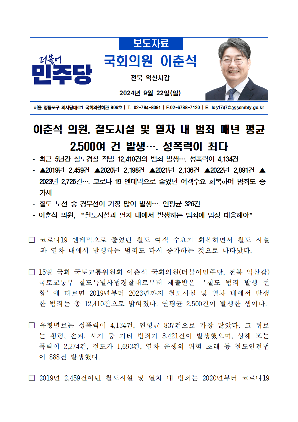 [이춘석 의원 국정감사 보도자료] 이춘석 의원, 철도시설 및 열차 내 범죄 매년 평균 2,500여 건 발생…. 성폭력이 최다