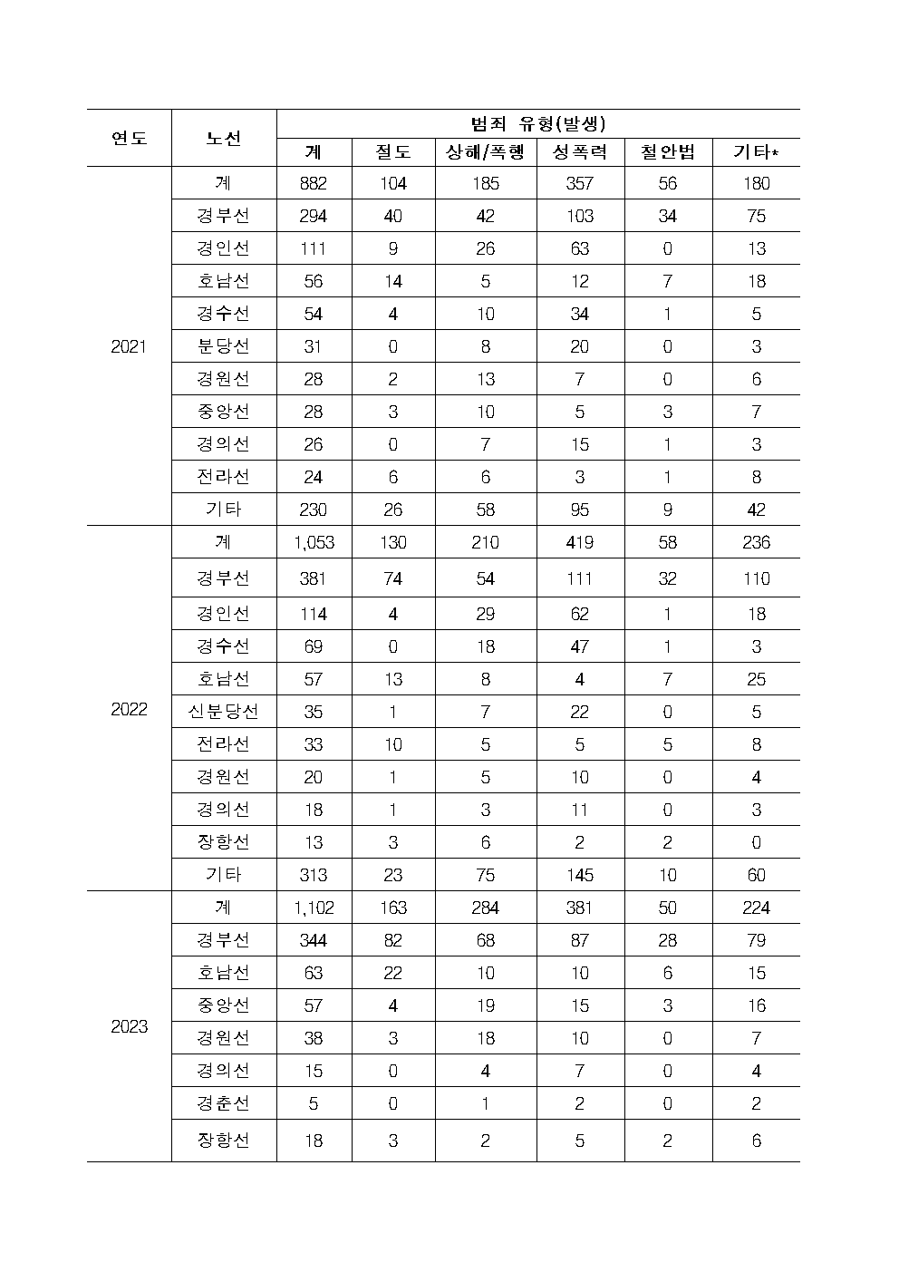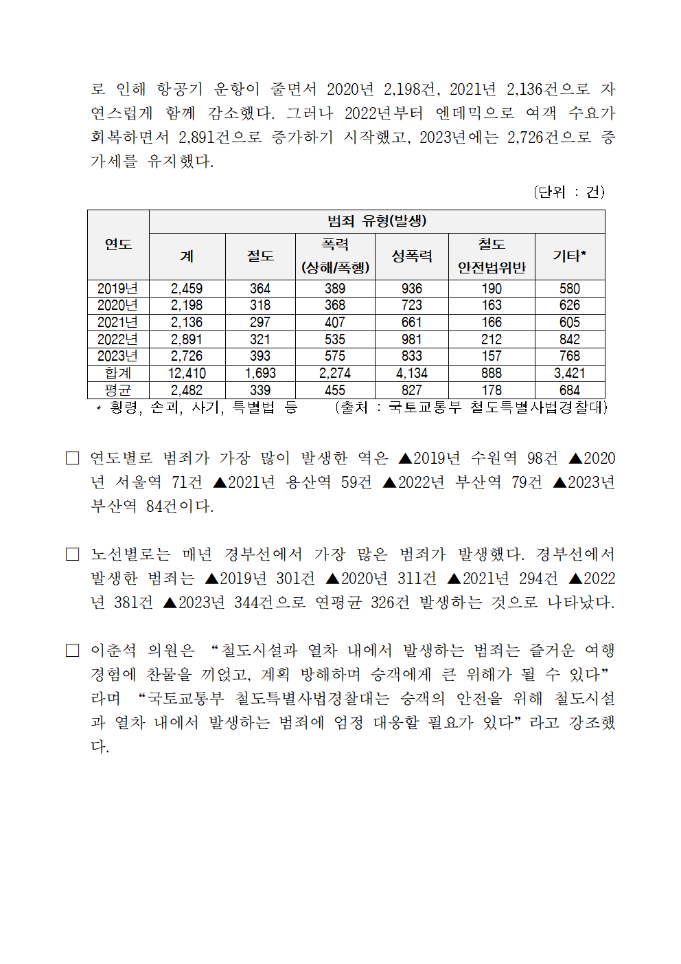 [이춘석 의원 국정감사 보도자료] 이춘석 의원, 철도시설 및 열차 내 범죄 매년 평균 2,500여 건 발생…. 성폭력이 최다