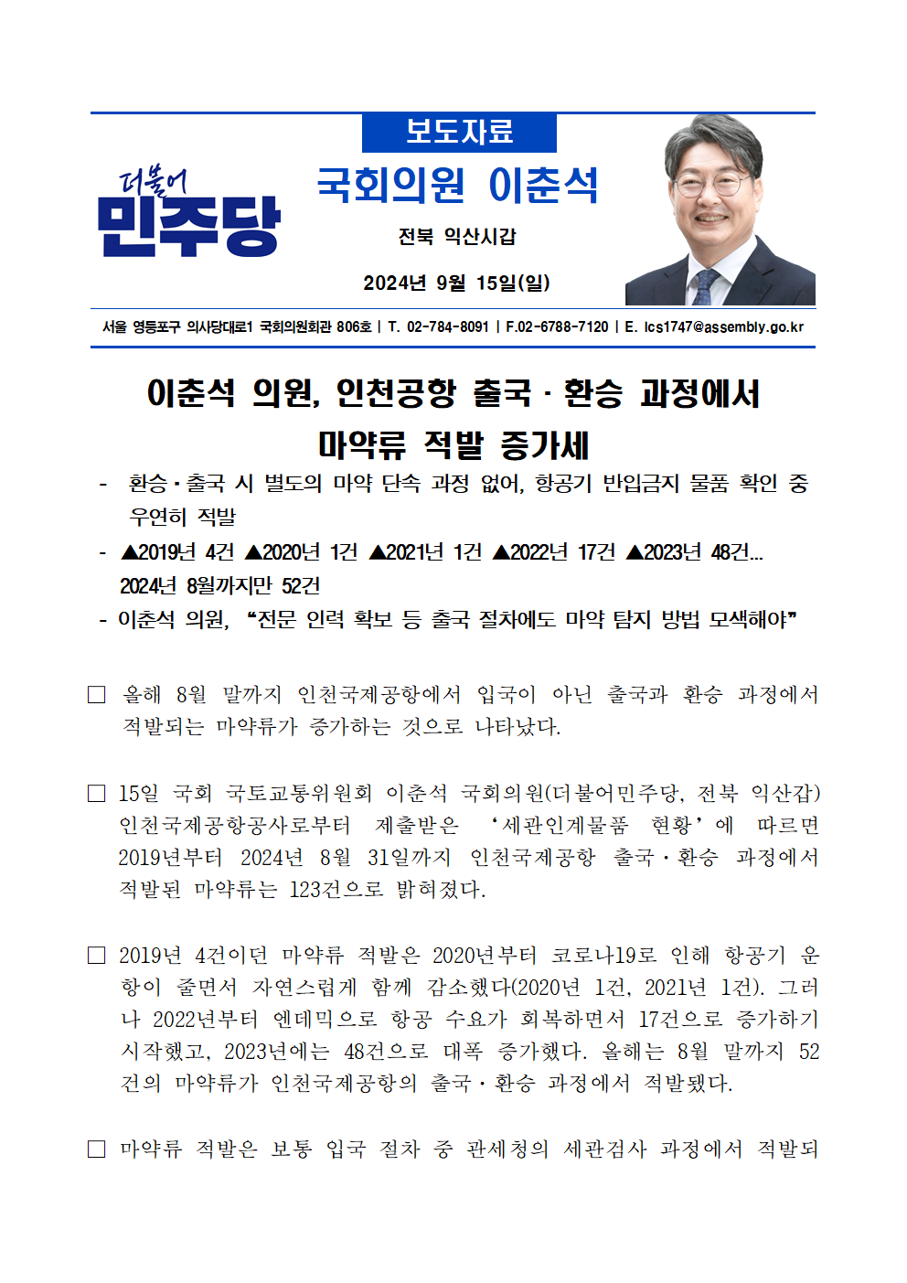 [국정감사_보도자료]_240915_이춘석_의원__인천공항_출국·환승_과정에서_마약류_적발_증가세.hwp