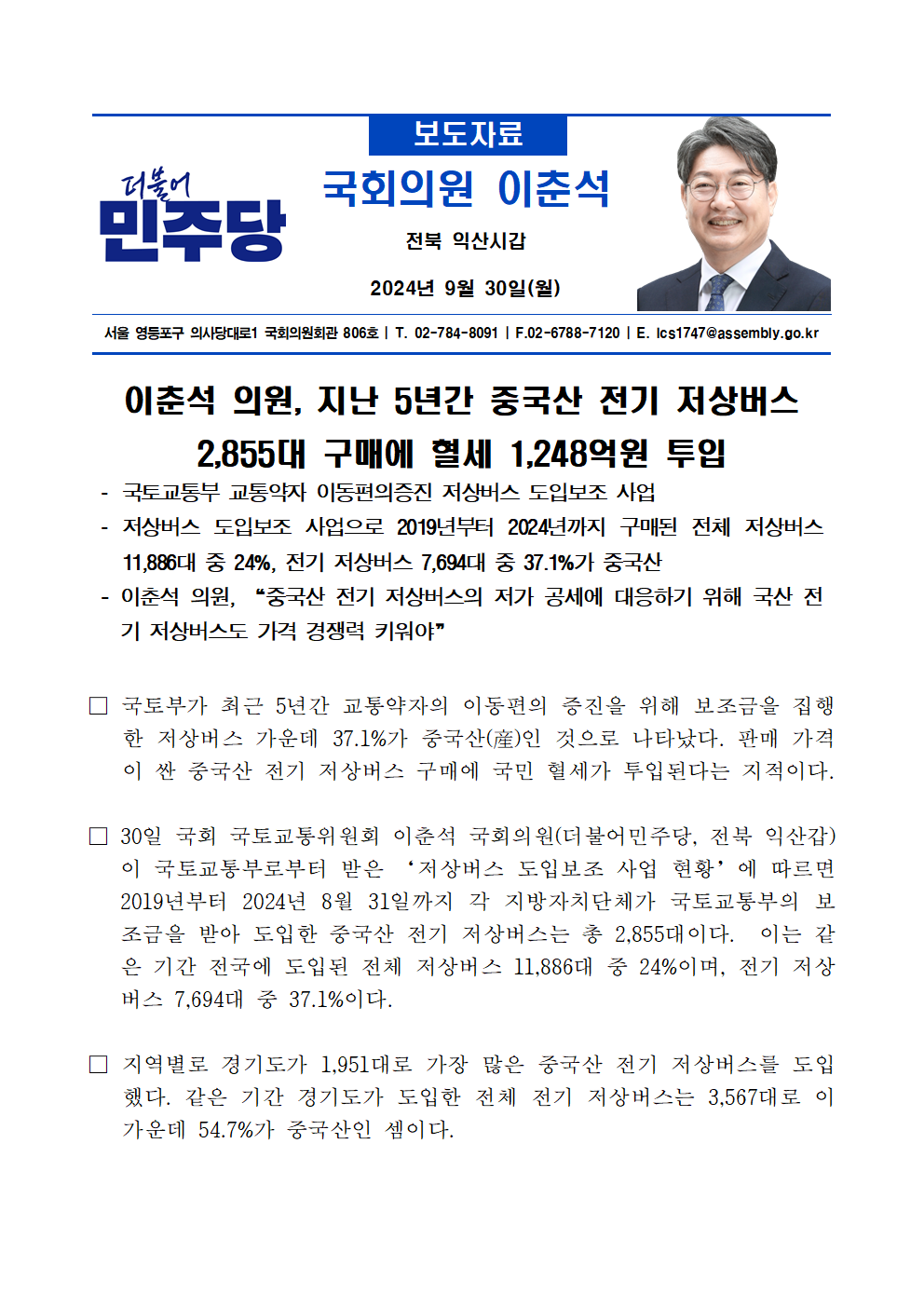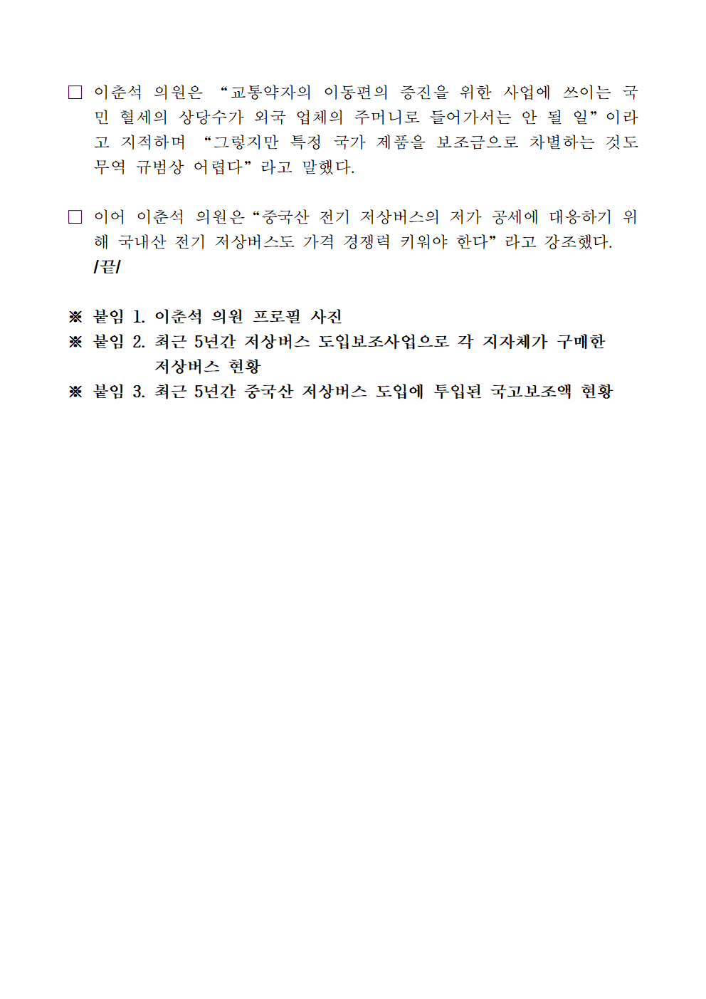 [국정감사_보도자료]_240930_이춘석_의원__지난_5년간_중국산_전기_저상버스_2_855대_구매에_혈세_1_248억원_투입.hwp
