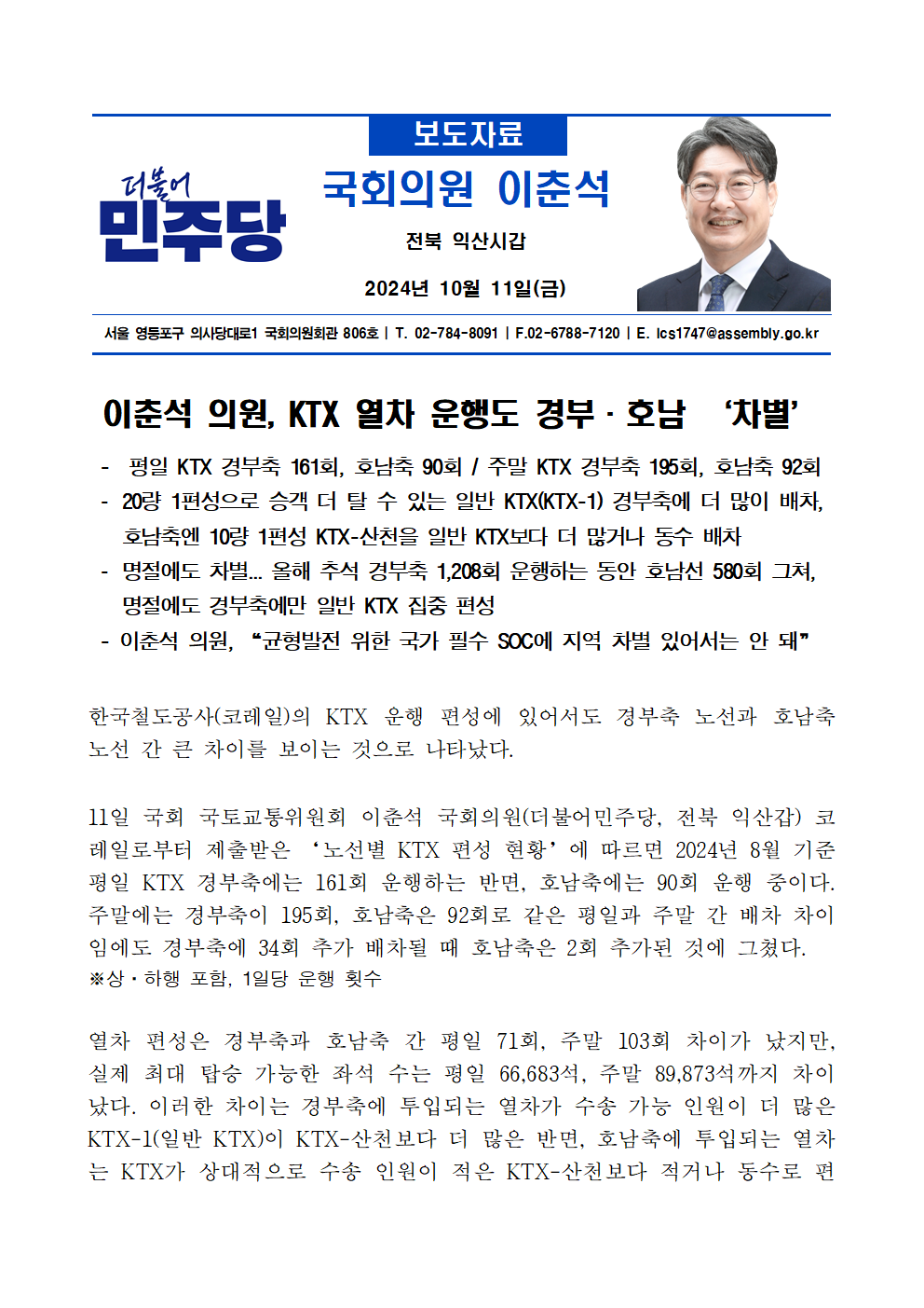 [국정감사_보도자료]_241011_이춘석_의원__KTX_열차_운행도_경부·호남_‘차별’.hwp