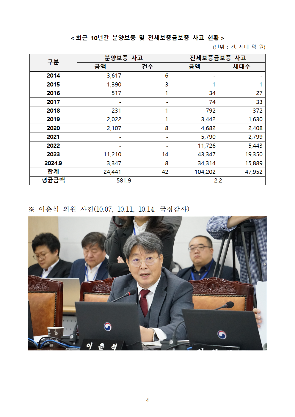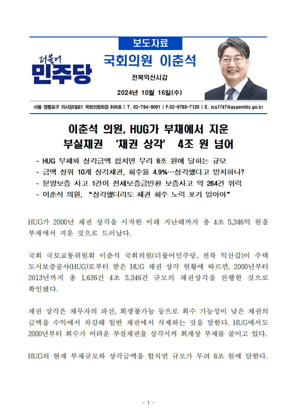 [이춘석 의원 국정감사 보도자료] 이춘석 의원, HUG가 부채에서 지운 부실채권 ‘채권 상각’ 4조 원 넘어