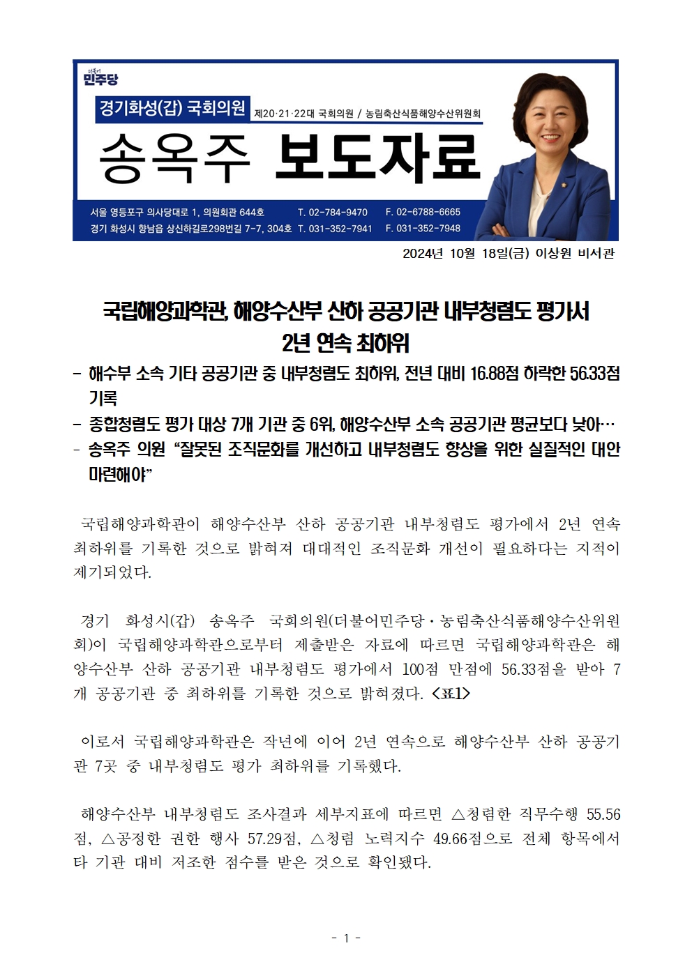 [국회의원 송옥주 국정감사 보도자료] 국립해양과학관, 해양수산부 산하 공공기관 내부청렴도 평가서 2년 연속 최하위