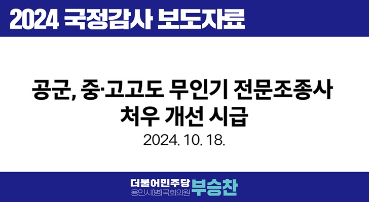 부승찬 더불어민주당 용인시병 국회의원은 10월 18일 2024년 공군본부 국정감사에서 고고도 무인 항공기 및 중고도 무인 항공기 조종사 처우 개선을 위한 종합적인 대책이 마련되어야 한다고 지적했다.