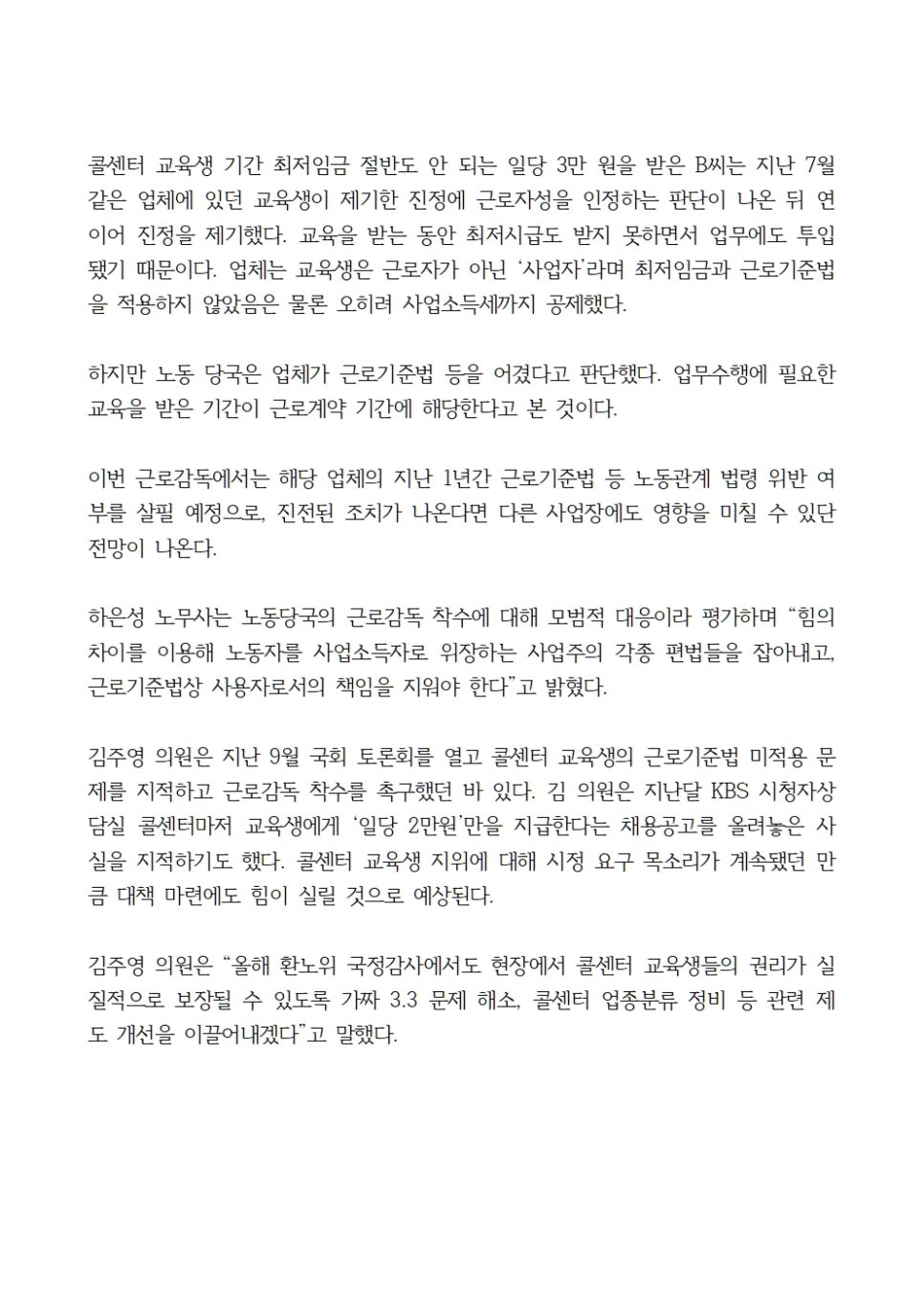 김주영 의원은 지난 9월 국회 토론회를 열고 콜센터 교육생의 근로기준법 미적용 문제를 지적하고 근로감독 착수를 촉구했던 바 있다. 김 의원은 지난달 KBS 시청자상담실 콜센터마저 교육생에게 ‘일당 2만원’만을 지급한다는 채용공고를 올려놓은 사실을 지적하기도 했다. 콜센터 교육생 지위에 대해 시정 요구 목소리가 계속됐던 만큼 대책 마련에도 힘이 실릴 것으로 예상된다.