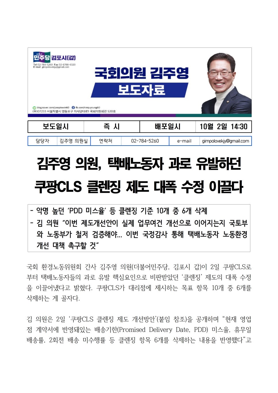 국회 환경노동위원회 간사 김주영 의원(더불어민주당, 김포시 갑)이 2일 쿠팡CLS로부터 택배노동자들의 과로 유발 핵심요인으로 비판받았던 ‘클렌징’ 제도의 대폭 수정을 이끌어냈다고 밝혔다. 쿠팡CLS가 대리점에 제시하는 목표 항목 10개 중 6개를 삭제하는 게 골자다.