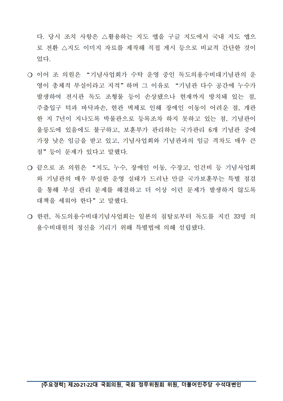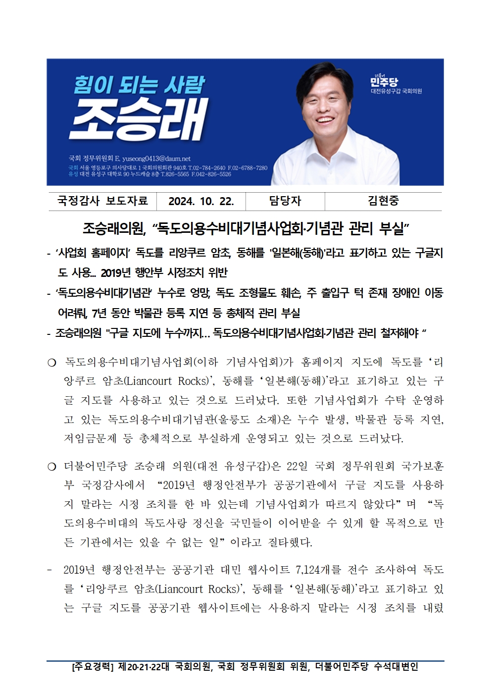 [국회의원 조승래] 조승래의원, “독도의용수비대기념사업회·기념관 관리 부실”