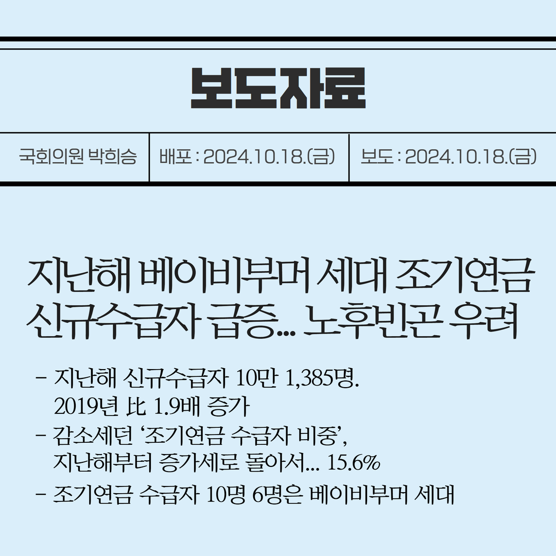 [국회의원 박희승 보도자료] 지난해 베이비부머 세대 조기연금 신규수급자 급증... 노후빈곤 우려