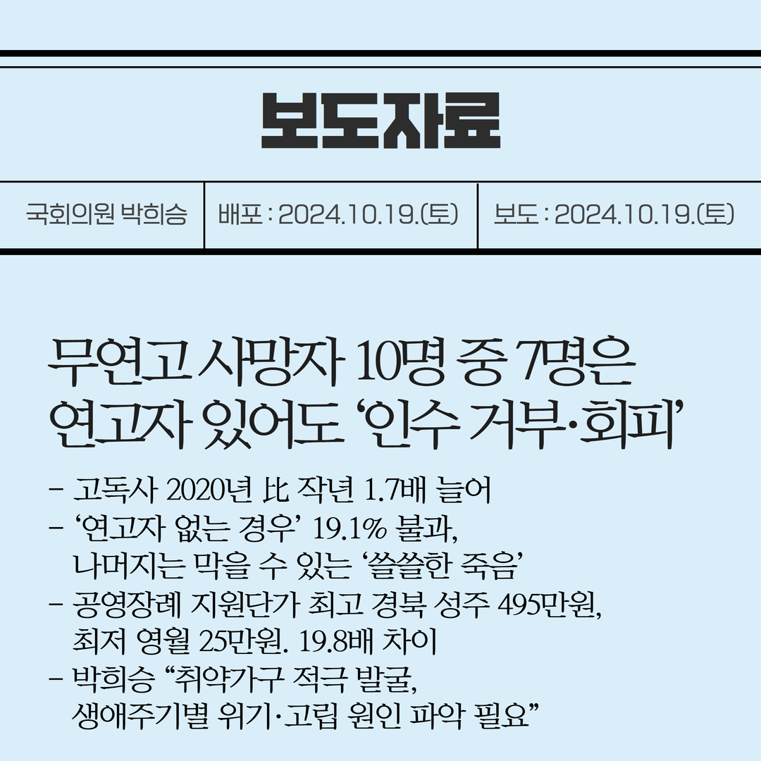 [국회의원 박희승 보도자료] 무연고 사망자 10명 중 7명은 연고자 있어도 ‘인수 거부·회피’