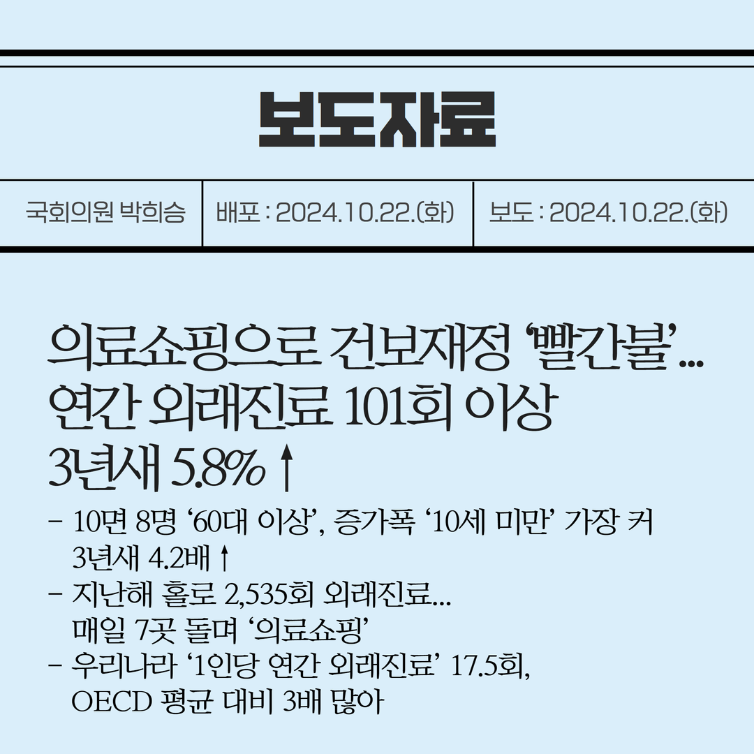 [국회의원 박희승 보도자료] 의료쇼핑으로 건보재정 ‘빨간불’... 연간 외래진료 101회 이상 3년새 5.8%↑