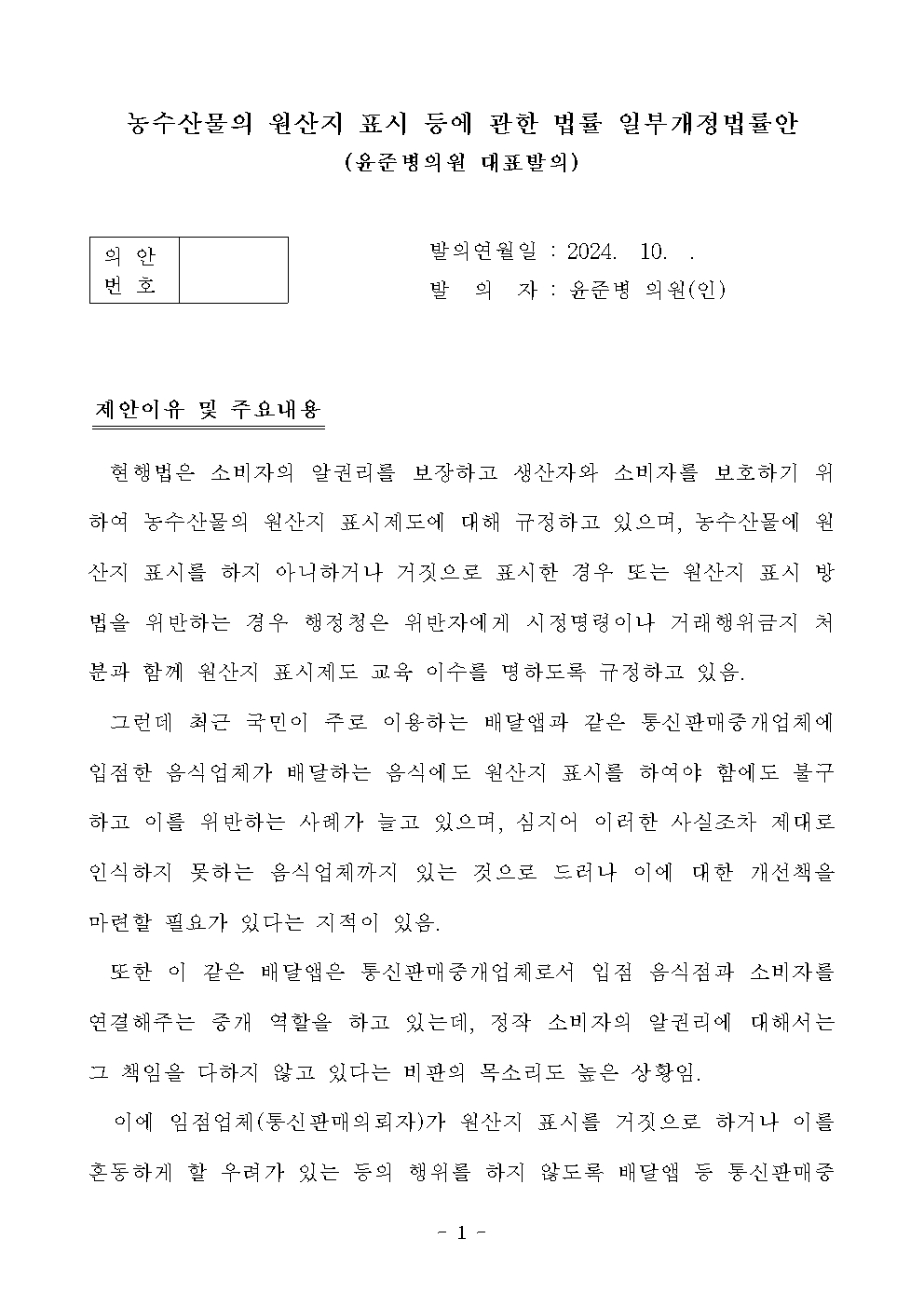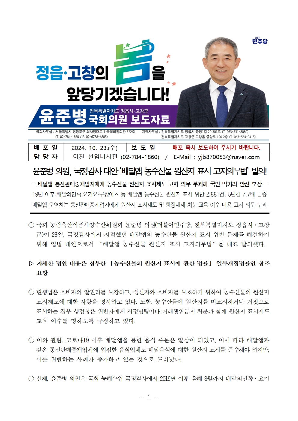 [윤준병 의원 국정감사 보도자료] 국정감사 대안 ‘배달앱 농수산물 원산지 표시 고지의무법’ 발의