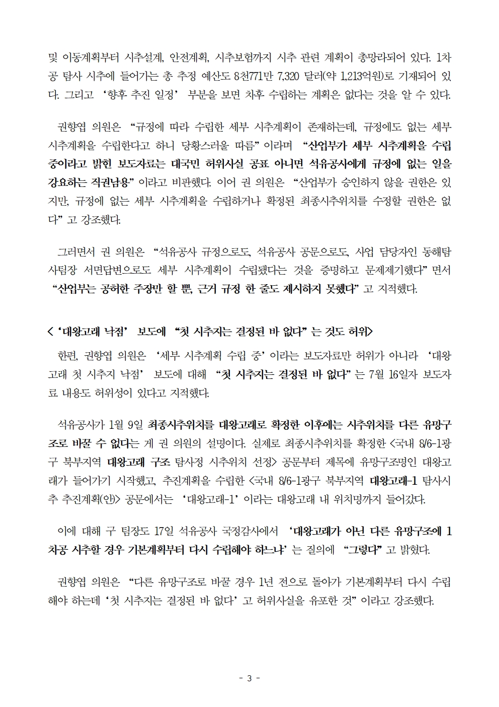 [권향엽 국회의원] 241024 보도자료_석유公 내규 준수해 1월 대왕고래 최종위치 확정 3월 세부 시추계획 수립.hwp