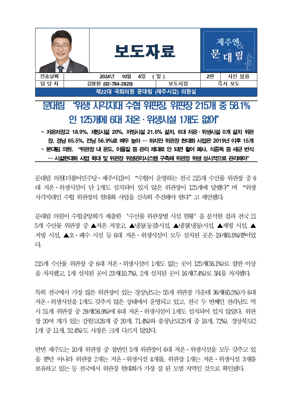 [국회의원 문대림] 위생 사각지대 수협 위판장, 위판장 215개 중 58.1%인 125개에 6대 저온·위생시설 1개도 없어