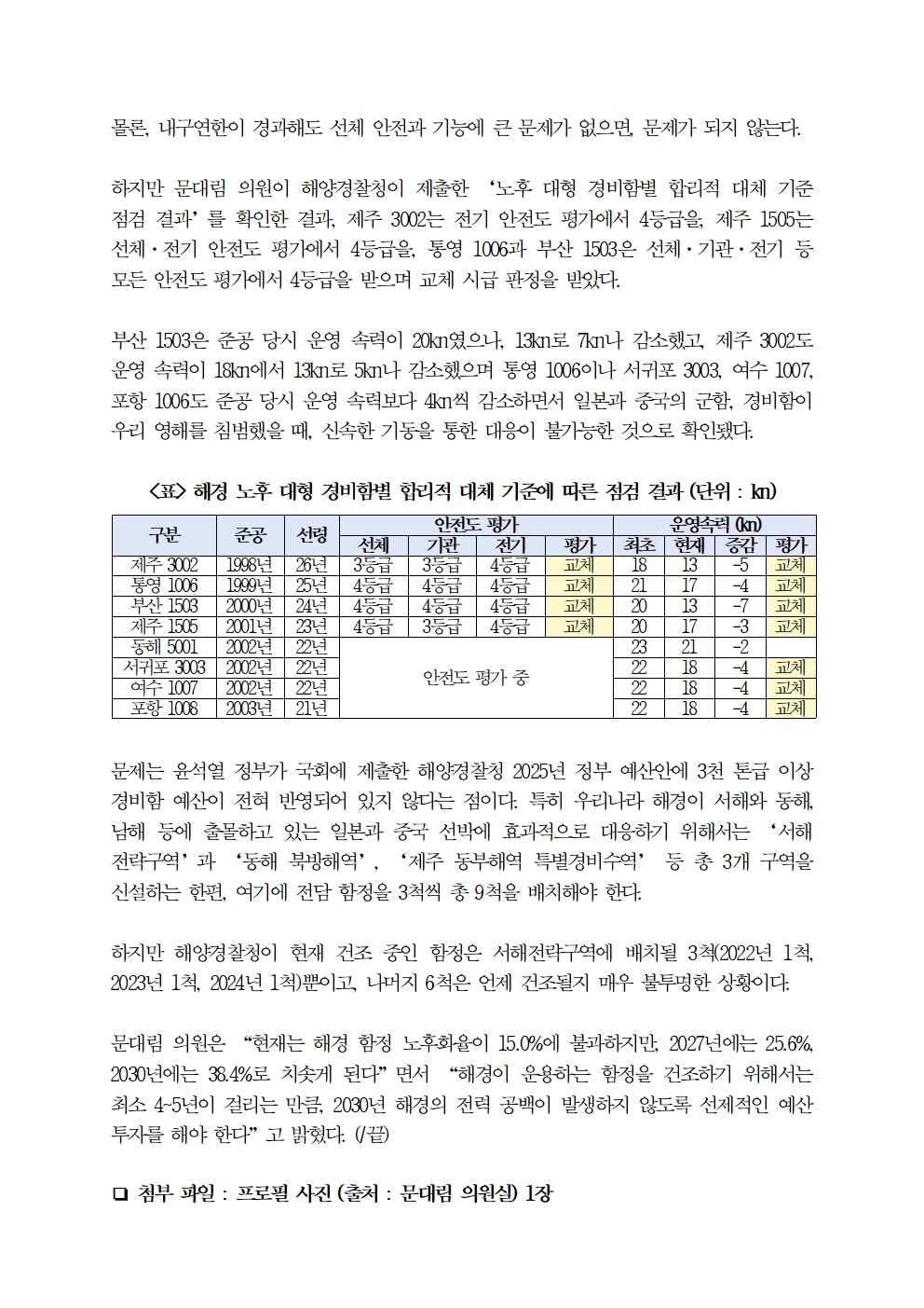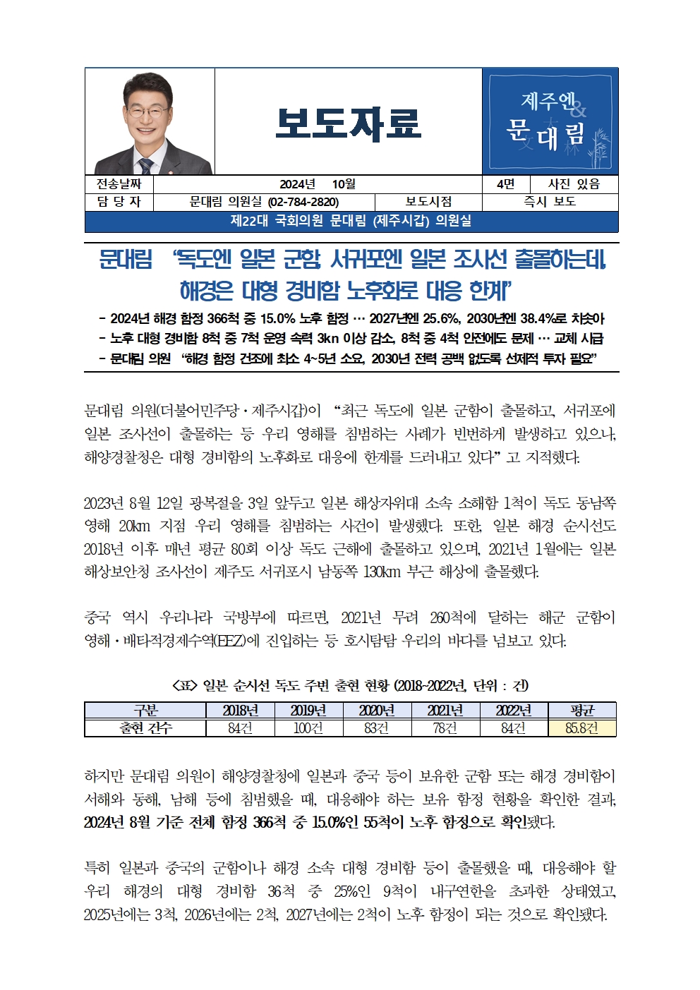 [국회의원 문대림] 독도엔 일본 군함, 서귀포엔 일본 조사선 출몰하는데, 해경은 대형 경비함 노후화로 대응 한계
