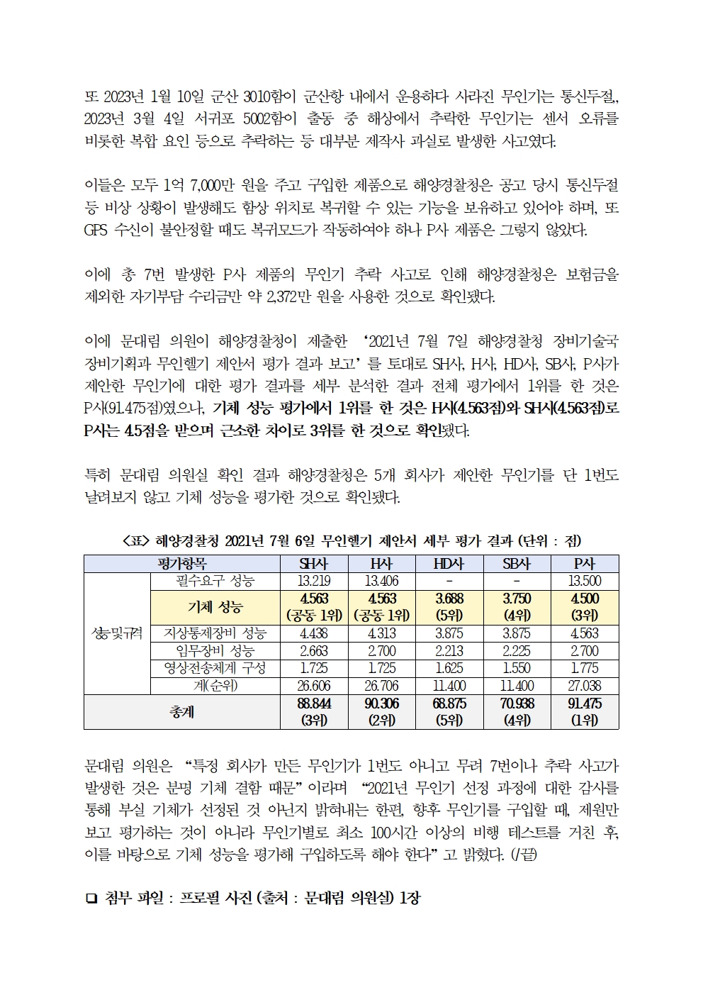 [국회의원 문대림] 해경 무인기 78대 중 사고 무인기 7대 모두 P사 제품 … P사 무인기 구입 과정 감사 필요