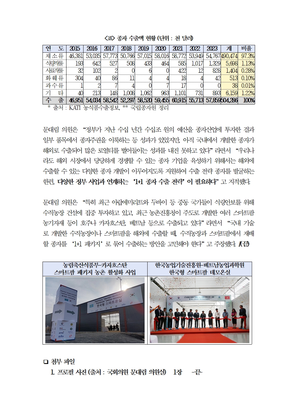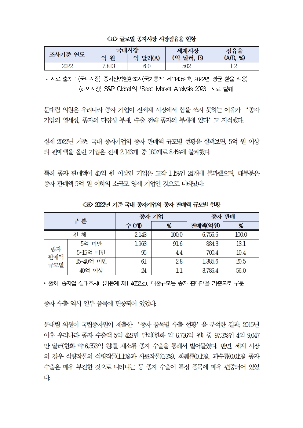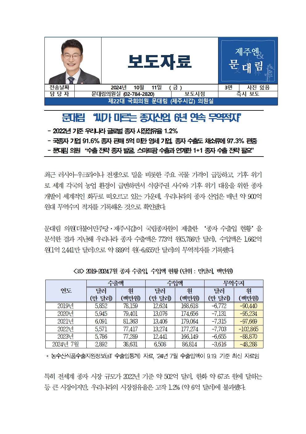 [국회의원 문대림] 씨가 마르는 종자산업, 6년 연속 무역적자