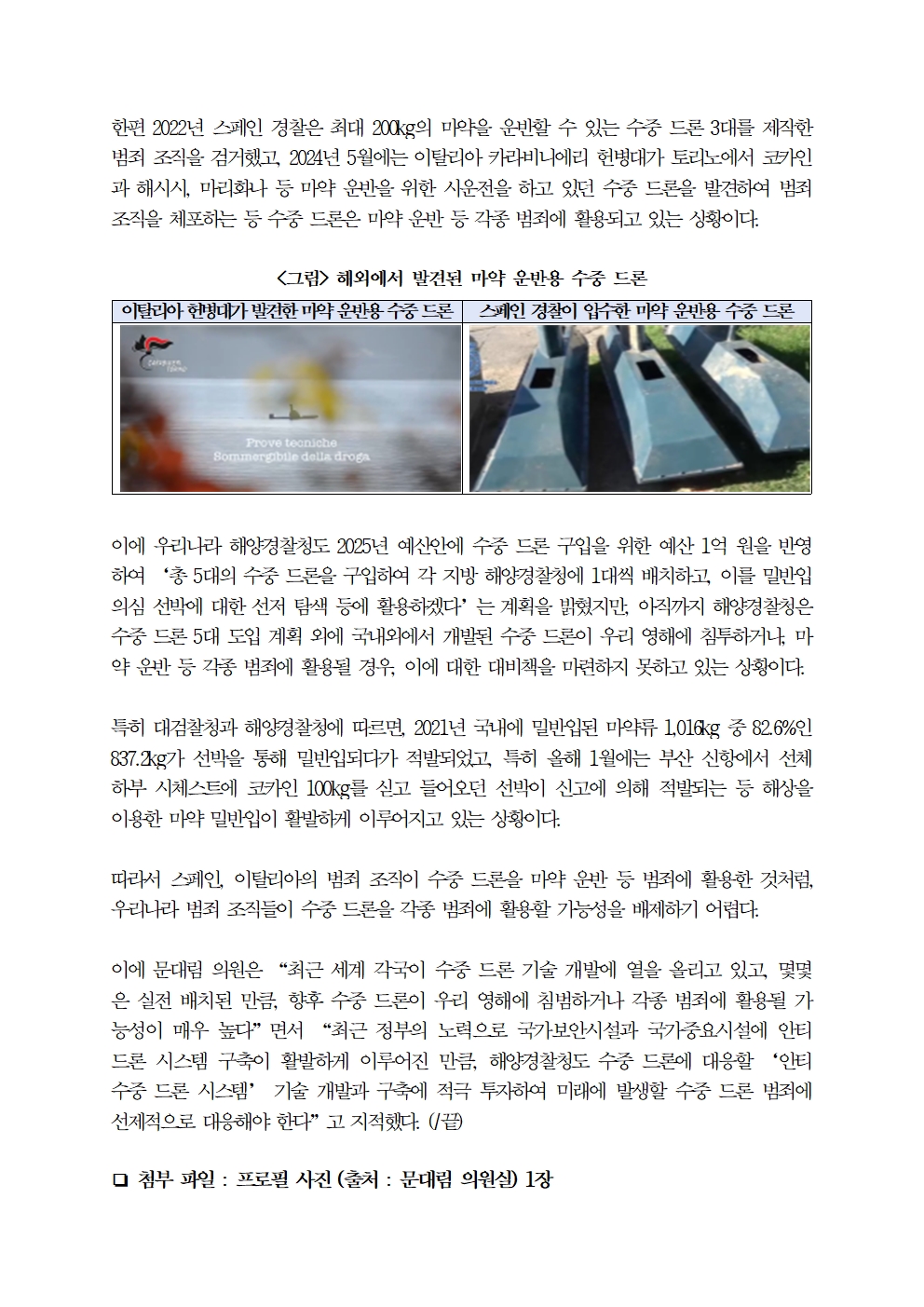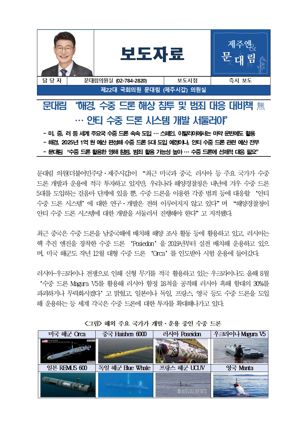 [국회의원 문대림] 해경, 수중 드론 해상 침투 및 범죄 대응 대비책 無 … 안티 수중 드론 시스템 개발 서둘러야