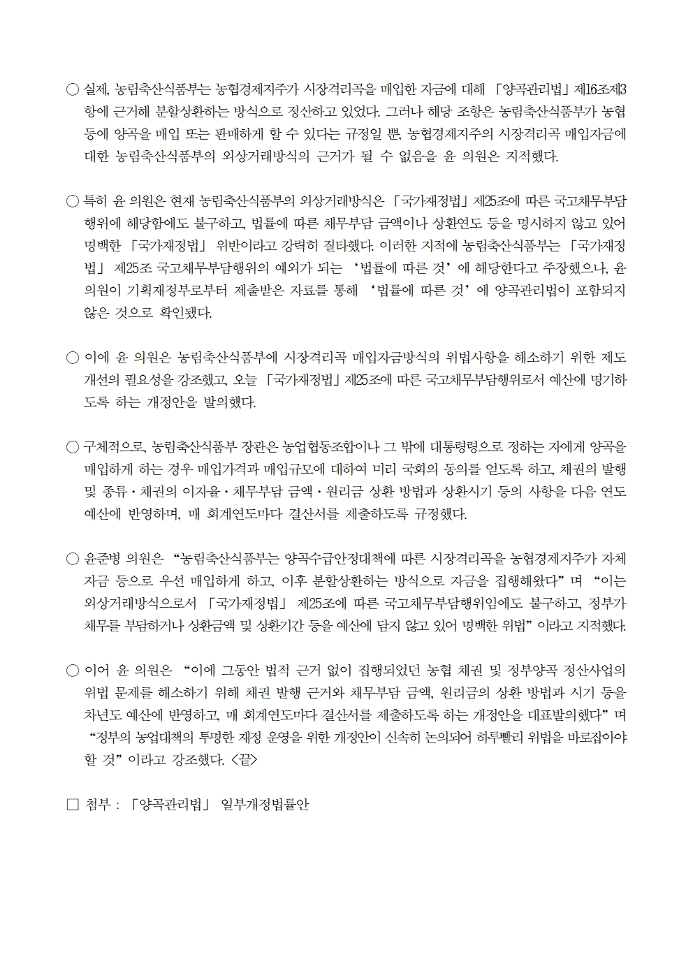 241025 [윤준병 의원 국정감사 보도자료] 윤준병 의원_ 국정감사 후속조치로 ‘농협 채권 및 정부양곡 정산 법제화’ 나서!.hwp
