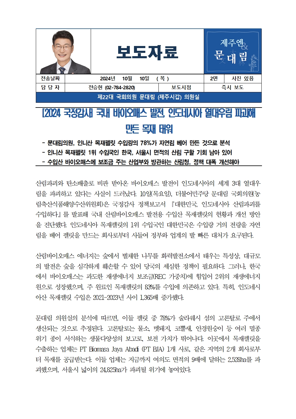 [문대림 의원 보도자료] 20241010 국내바이오매스발전 인도네시아열대우림파괴해만든목재태워.hwp
