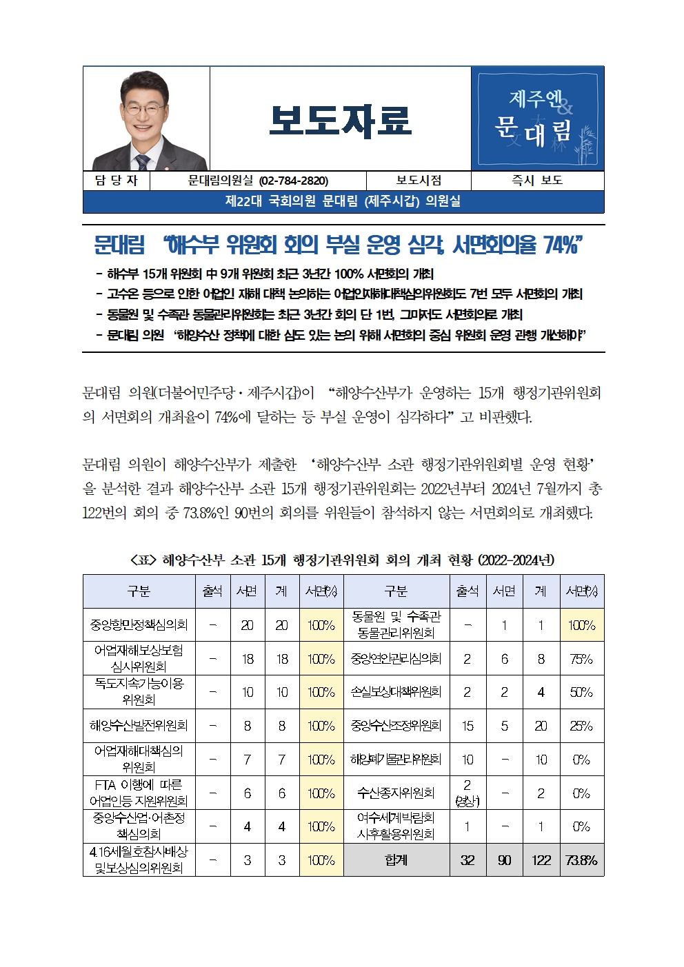 [국회의원 문대림] 해수부 위원회 회의 부실 운영 심각, 서면회의율 74%