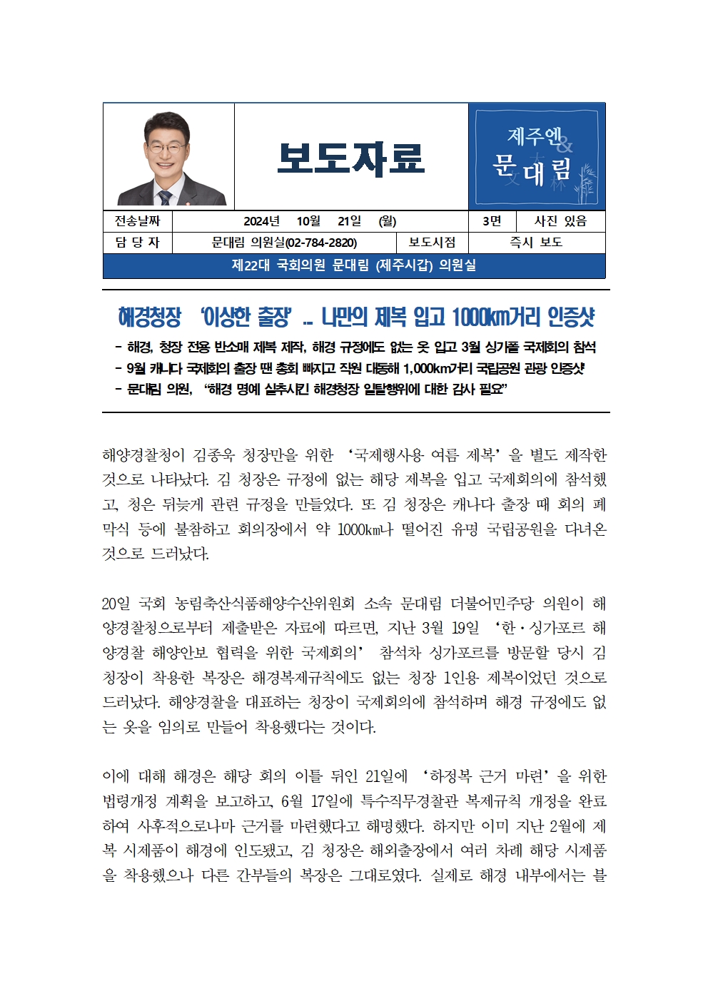 [문대림 의원 보도자료] 해경청장 ‘이상한 출장’... 나만의 제복 입고 1000km거리 인증샷.hwp