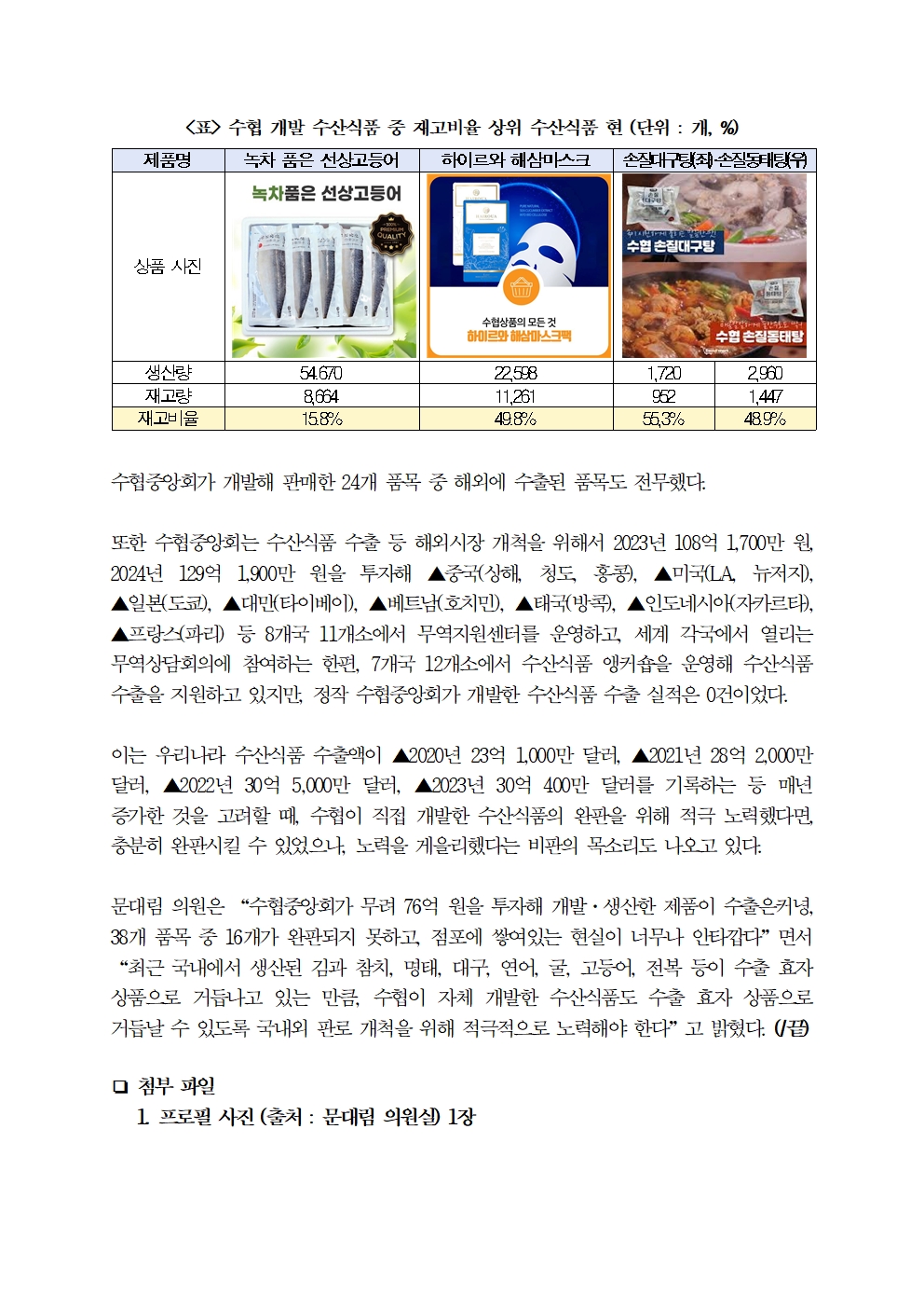[국회의원 문대림] 수협 76억 원 투자해 개발·생산한 수산식품 수출 제로 … 14개 품목은 출시도 못해