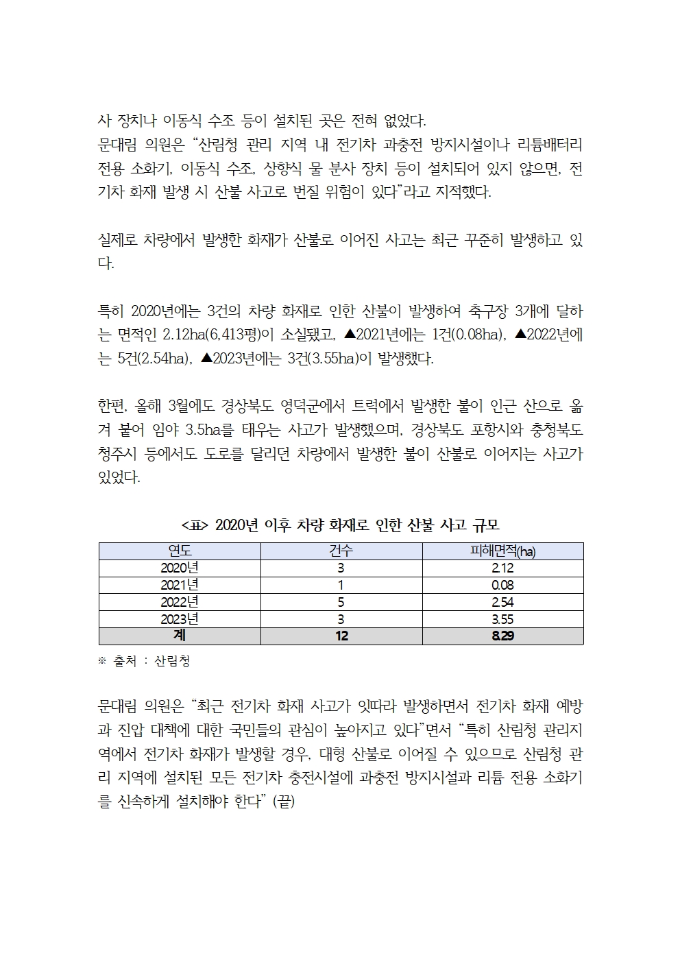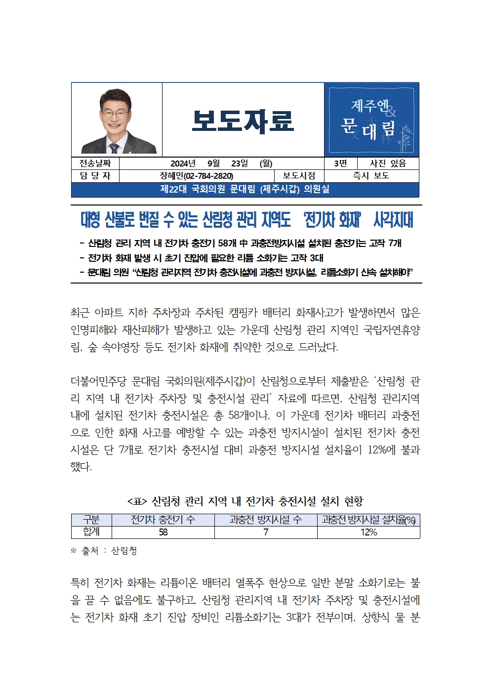 [국회의원 문대림] 대형 산불로 번질 수 있는 산림청 관리 지역도 ‘전기차 화재’ 사각지대