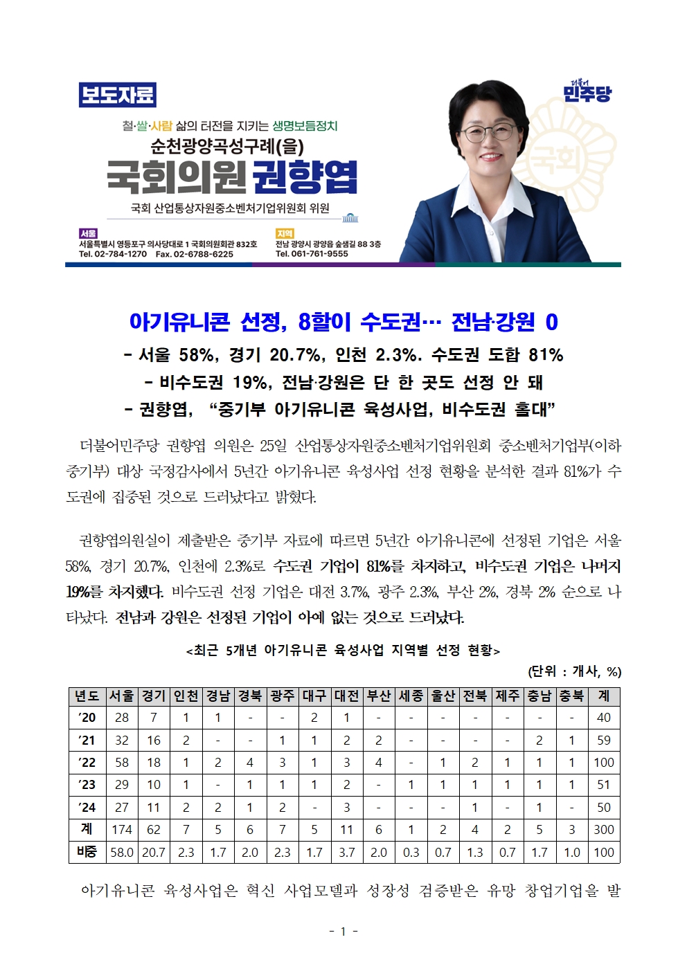 [권향엽 국회의원] 241025 보도자료_아기유니콘 선정 8할이 수도권… 전남‧강원 0.hwp