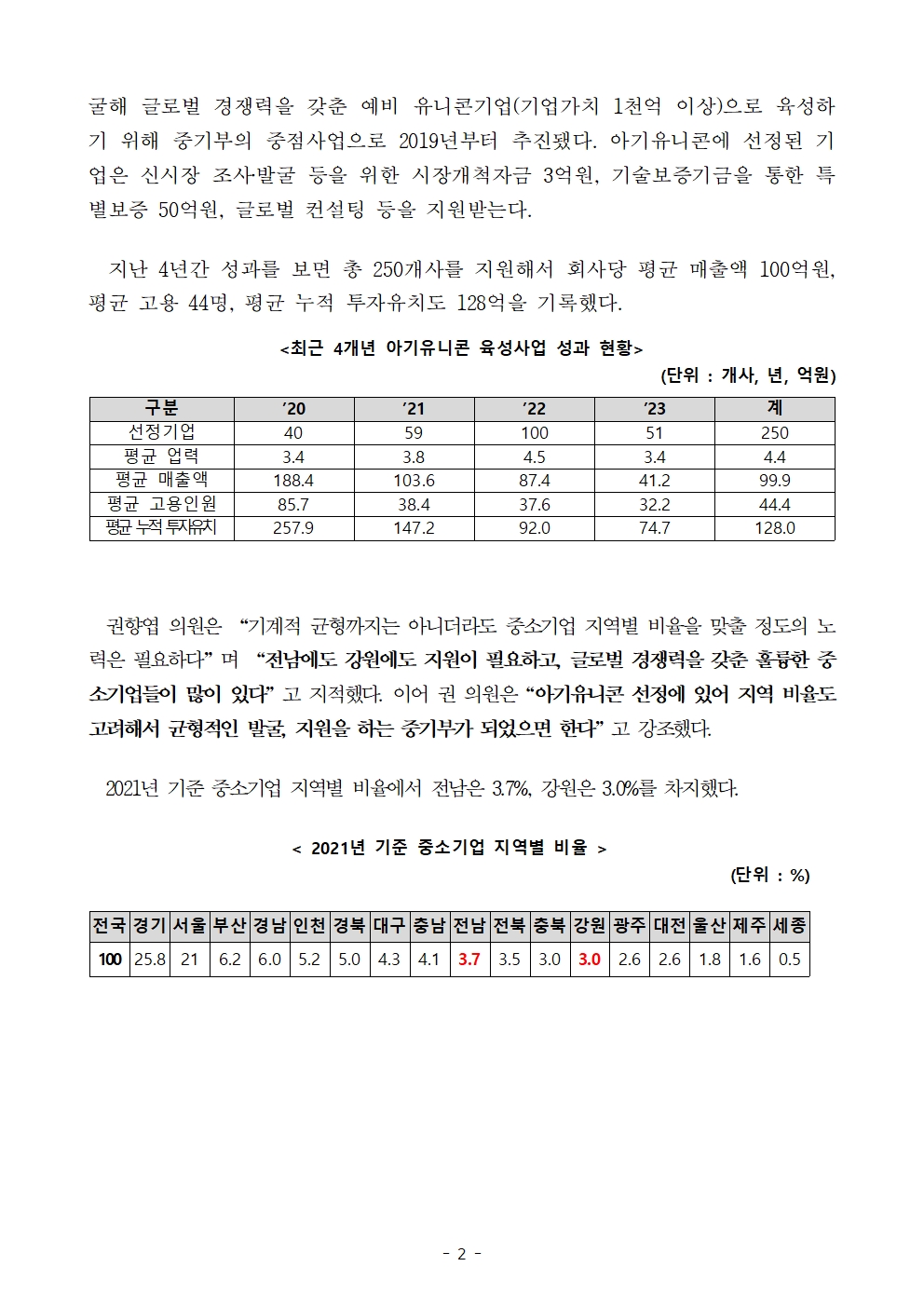 [국회의원 권향엽] 아기유니콘 선정, 8할이 수도권… 전남‧강원 0